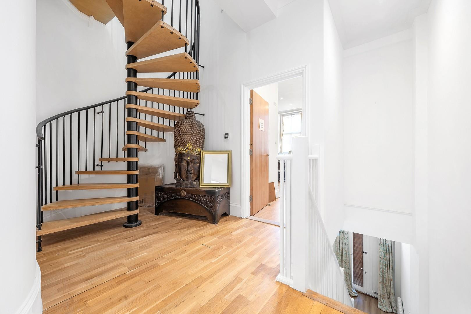 The first floor hosts two generous double bedrooms, each with its own en-suite. One of these bedrooms also boasts a walk-in dressing room, offering an added sense of luxury and practicality. A spiral staircase rises to the top floor, forming a striking architectural feature at the centre of the home.