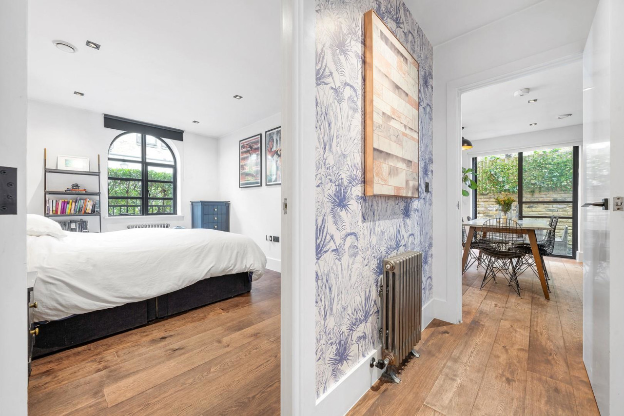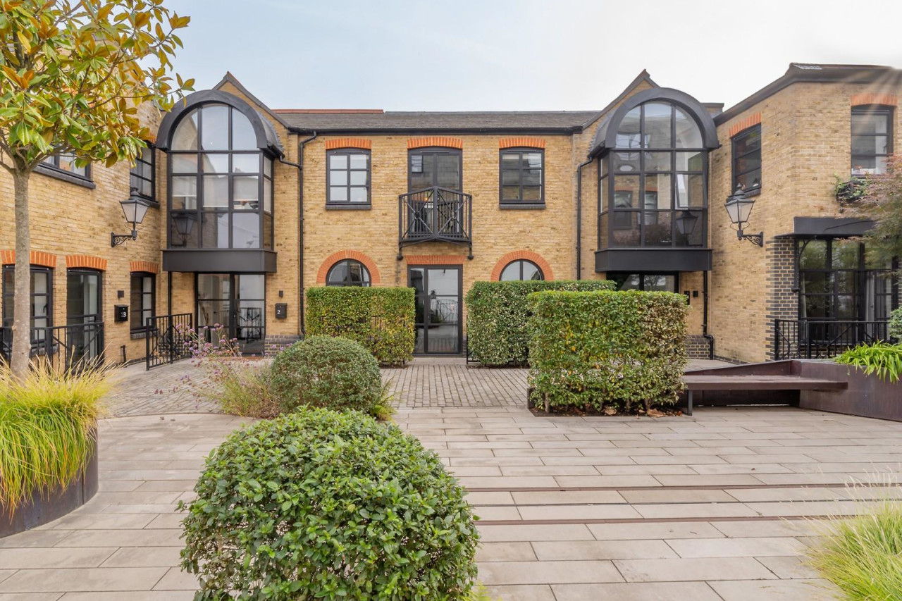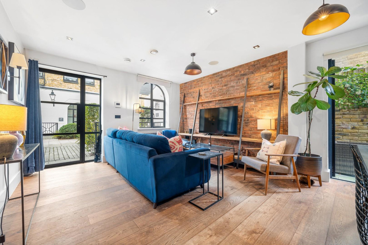 This exclusive development is set behind grand arched gates which lead around to the central courtyard, off which sits this apartment, with its own private entrance creating an immediate sense of individuality. Set back behind privacy hedging and elegant black railings, a large glass door flanked by arched windows introduces the property with character and charm. Stepping inside, the apartment continues to impress with a design that is both warm and industrial, accentuated by exposed brickwork, bespoke finishes, and thoughtful architectural detailing.