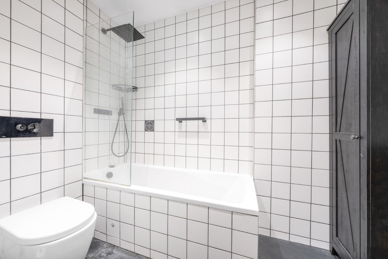 The bathroom is a luxurious sanctuary, finished to the highest standard. Stylish black floor tiles are paired with matt white wall tiles for a timelessly classic look. A double-ended bath with rain-shower, frameless glass screen and a bespoke vanity unit in wood and iron combine to create a sophisticated and calming ambience.