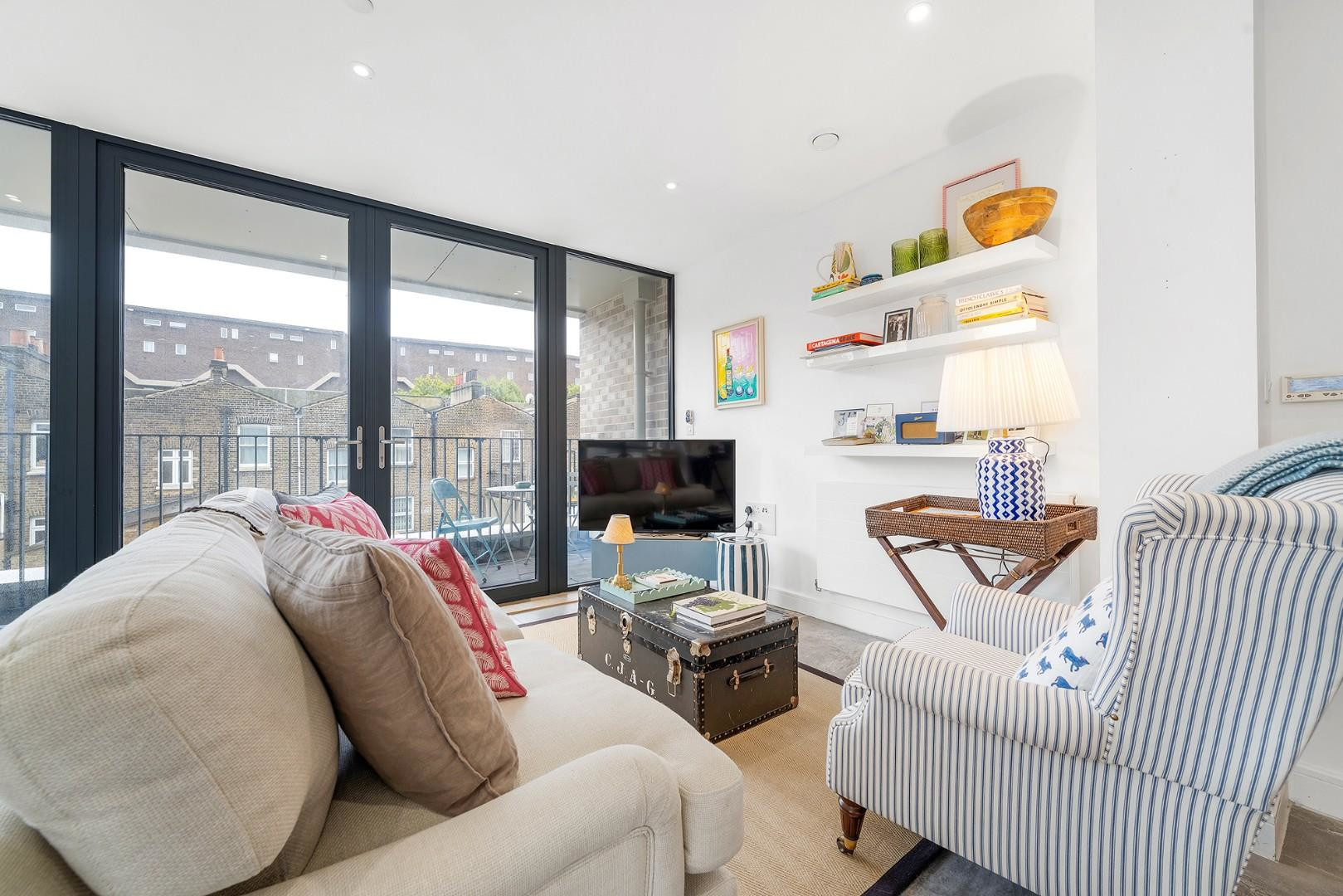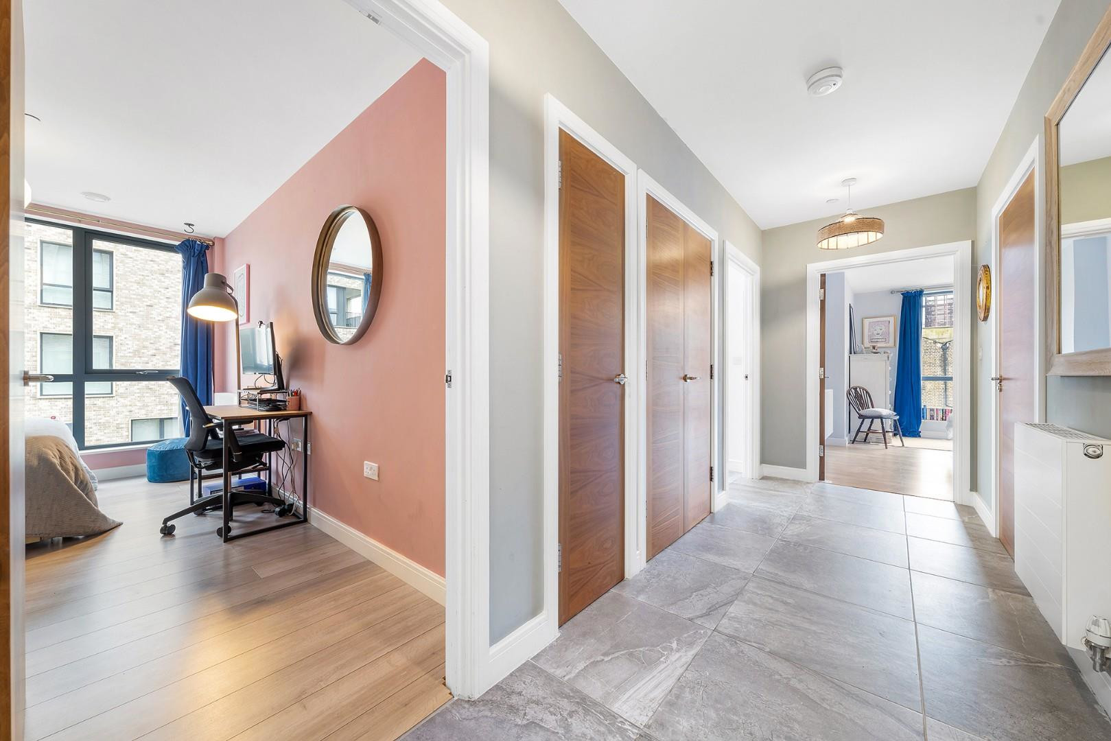Set to opposing sides of the property, ideal for privacy suited to sharers, the two large double bedrooms are flooded with light from full height windows, glazed to the highest modern energy standards. The principal bedroom is particularly spacious and benefits from large fitted wardrobes. Conveniently set in the centre of this beautiful home, the bathroom is spacious with a high standard of fittings including a heated towel rail and a bath with overhead shower, ideal for those moments only a peaceful soak in the tub will do. Last but not least, the interior is completed by further storage cupboards in the appealing entrance hall.
