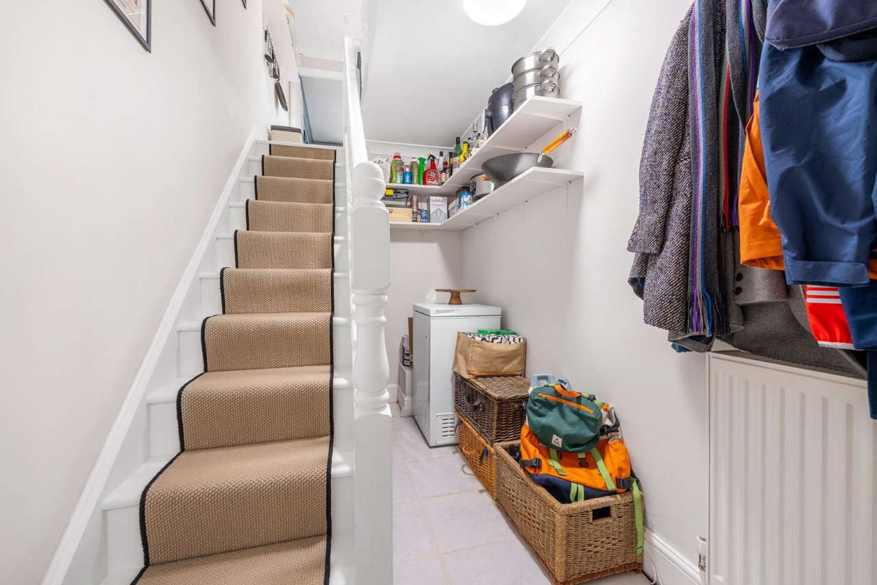 Descending the stairs leads to the lower ground level, where you’ll find a well-planned utility room or pantry, a highly practical addition for storage, laundry, or supplementary space.