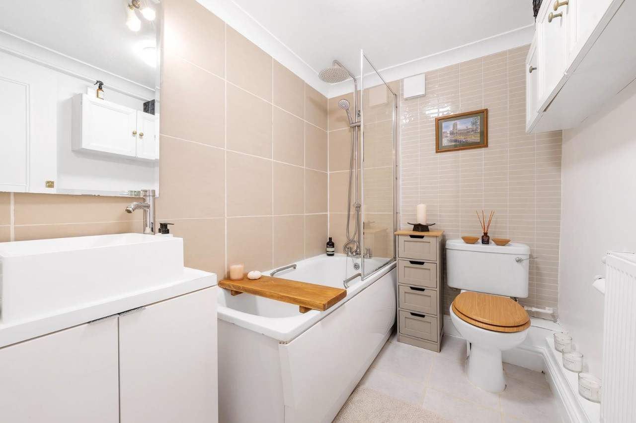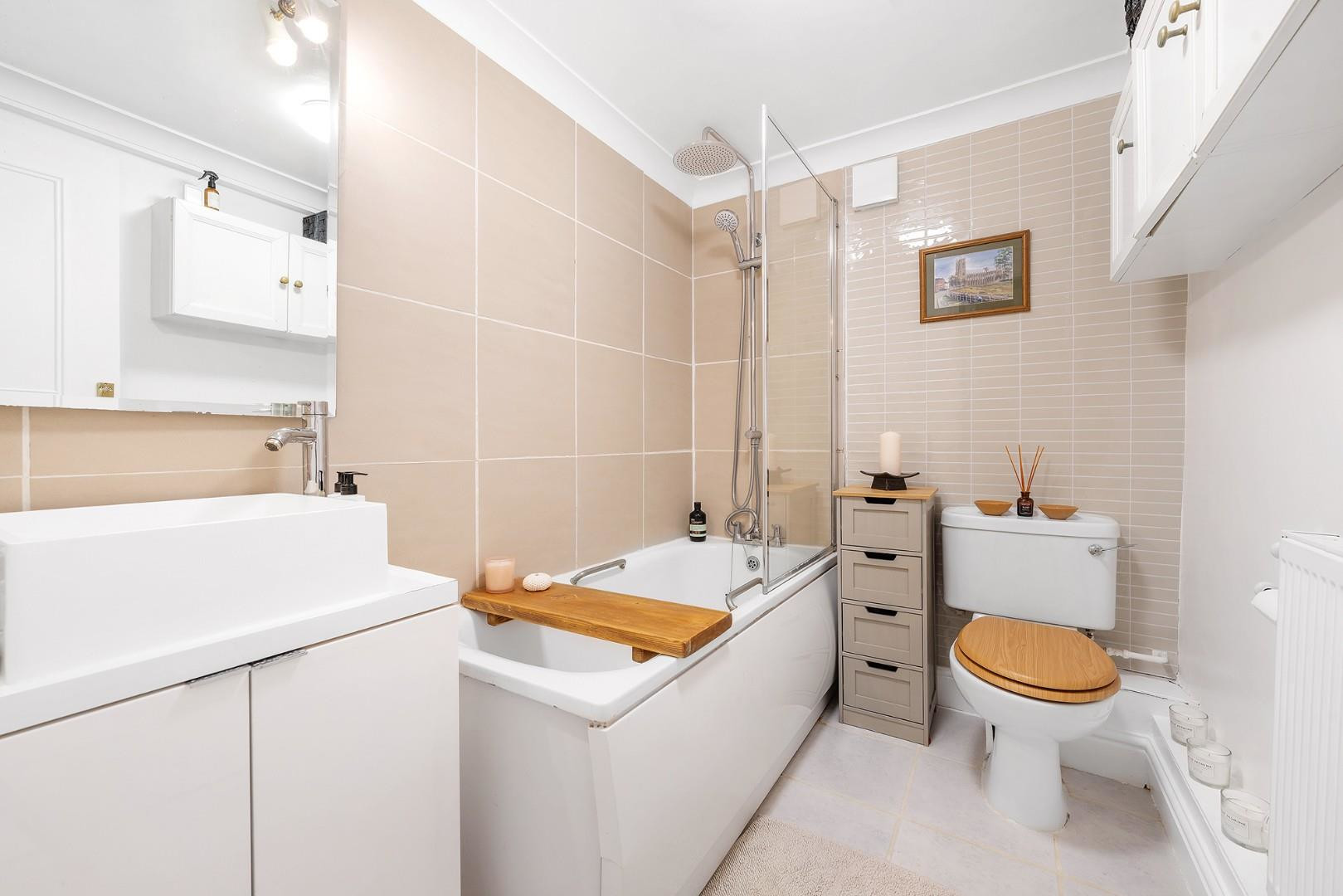 Finished in neutral tones, the bathroom features a classic white suite with a shower over the bath, complemented by cream tiling and a vanity unit with cupboard storage. The layout makes efficient use of space, providing a comfortable and calming environment.