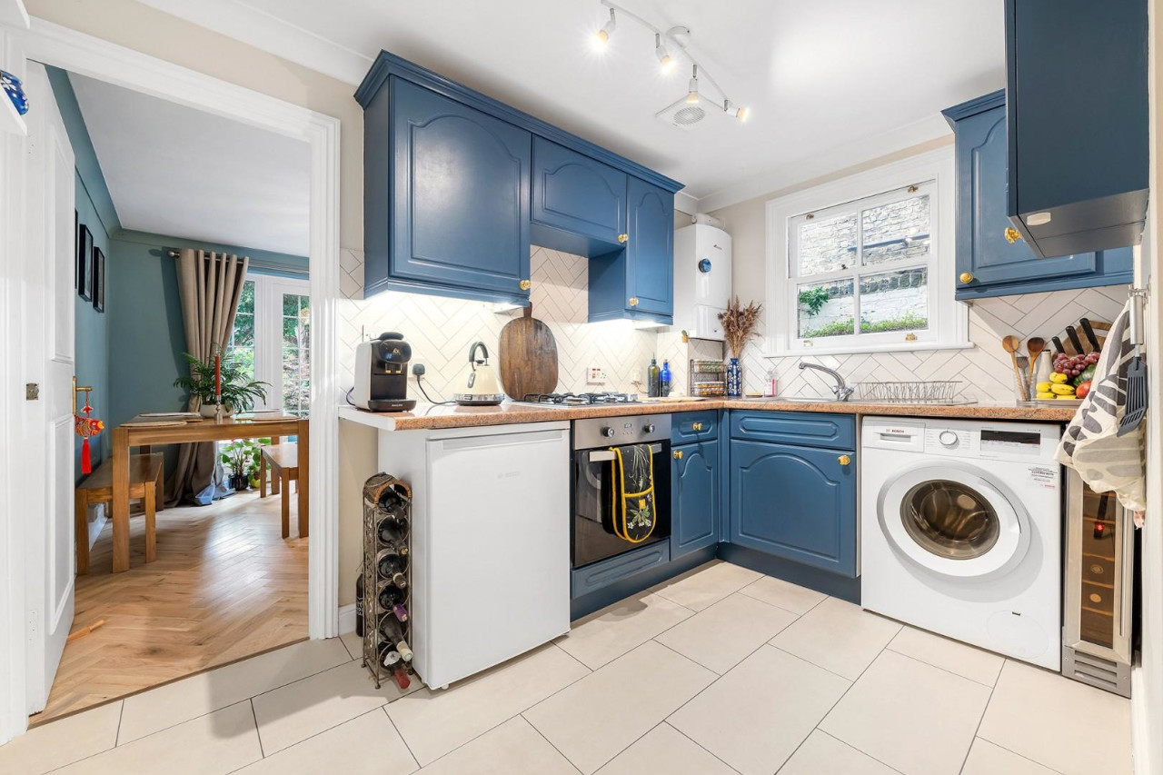 The separate kitchen is styled with dark blue cabinetry, offset by a crisp white herringbone tile splashback to create a striking yet timeless aesthetic. Integrated appliances include a gas hob and oven, while an integrated wine cooler adds a touch of luxury. A sash window positioned above the sink allows for excellent ventilation and natural light, making this kitchen both practical and a pleasure to cook in.