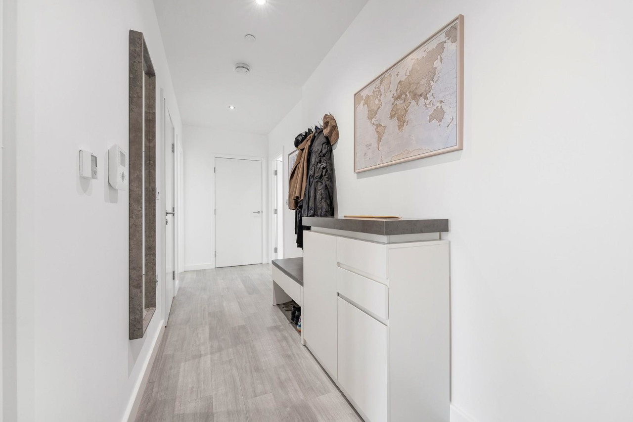 The heart of the home is the spacious open-plan reception where full-height windows frame far-reaching views across the London skyline, while the adjoining South-facing private terrace offers a serene outdoor retreat—perfect for morning coffee or evening aperitifs as the sun sets. Sure to impress, the inviting living area provides ample space for a lounge and dining setup, while the stylish kitchen features sleek white cabinetry integrated appliances—including a microwave, dishwasher, and wine cooler—delivering both practicality and a contemporary aesthetic. A handy utility cupboard in the hallway liberates space in the kitchen whilst keeping the laundry tucked neatly away and providing additional storage.