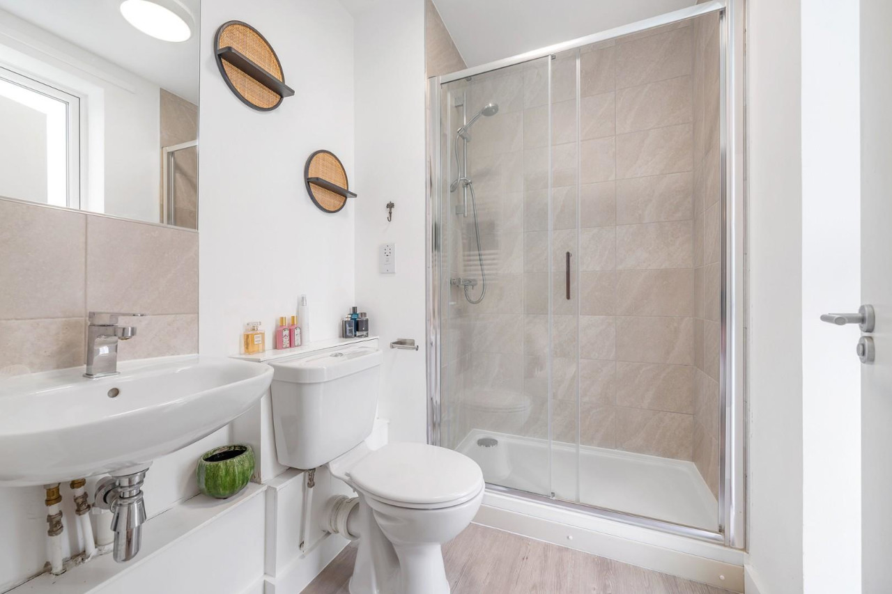 Both bedrooms are generous doubles, positioned at opposite ends of the apartment for maximum privacy. The principal bedroom benefits from built-in wardrobes and the luxury of an en-suite shower room, while the second bedroom, currently arranged as a nursery, provides versatility as a home office, guest room or comfortable double. Conveniently set in the centre of the home, just across from the second bedroom, the main bathroom offers a soothing environment ideal for a relaxing soak in the bathtub.