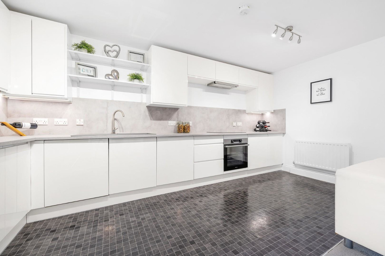 Sleek flooring subtly defines the kitchen area, enhancing the natural flow of the open-plan space. The kitchen is modern and functional, featuring stylish matt white handleless cabinetry and integrated appliances, including an induction hob with extractor, oven, and dishwasher. Its minimalist design ensures timeless appeal, with plenty of storage and workspace, making it a pleasure to cook here.