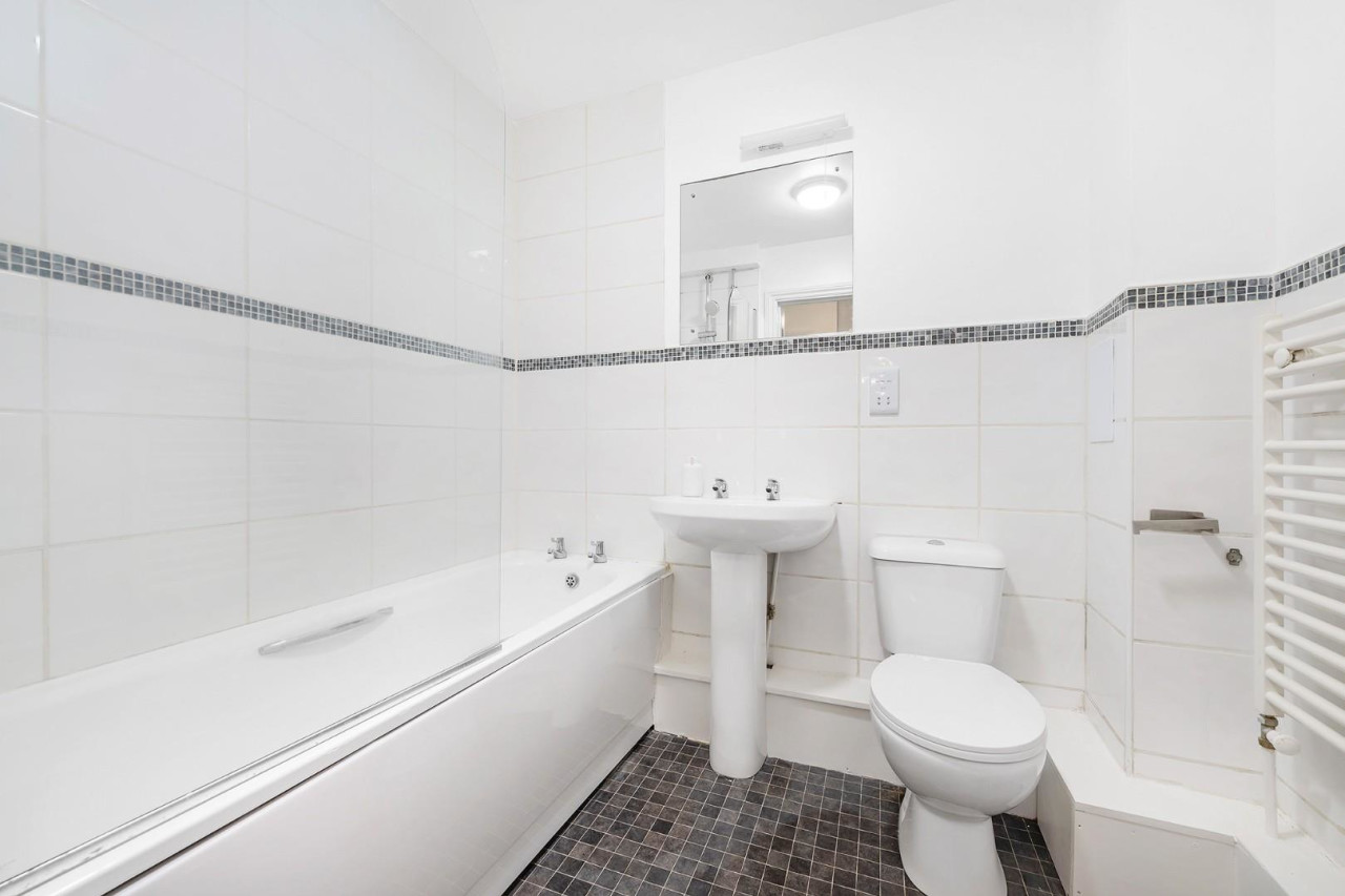 The bathroom features a classic white suite with a shower over the bath. Clean lines, neutral tiling, and a bright atmosphere make this a refreshing and relaxing space to unwind after a long day.