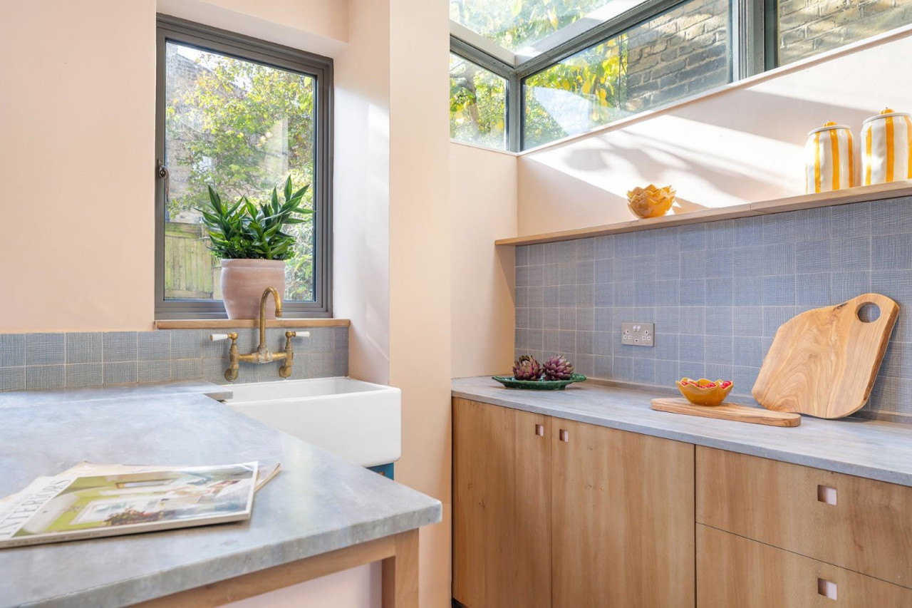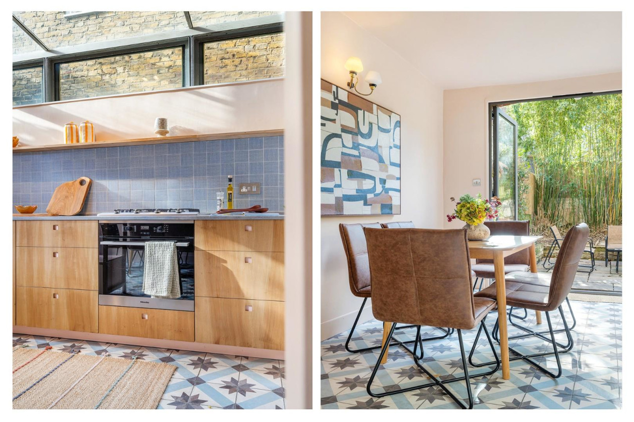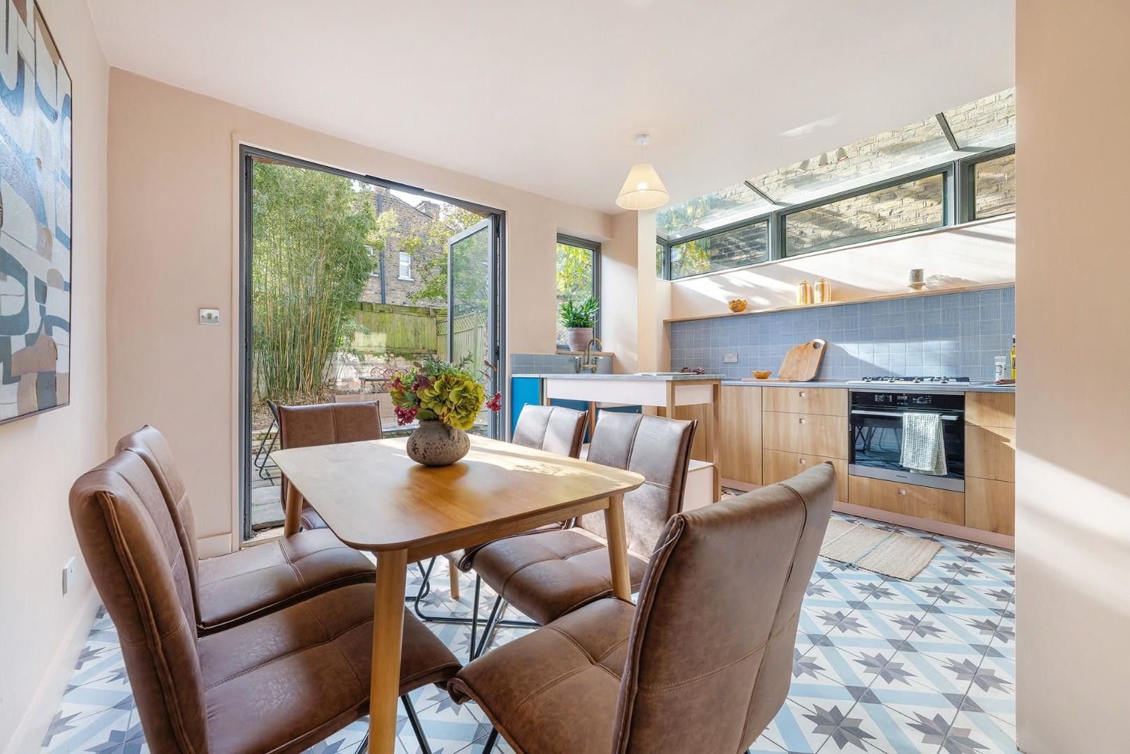 Beyond the reception, the heart of the home lies in the beautifully extended kitchen, a striking yet harmonious blend of modern design and classic charm. Painted in a soft pink, the walls provide a warm backdrop to the bold blue geometric floor tiles, which add depth and character. Sleek wooden cabinetry offers ample storage, complemented by a contemporary blue-tiled splashback and integrated appliances, including a Miele oven and gas hob. A traditional butler sink enjoys lovely views over the rear garden, and overhead clerestory windows flood the space with sunlight while maintaining privacy. There’s also room for a breakfast table, creating the perfect spot for informal dining. Glazed French doors open directly onto the garden, ensuring a seamless transition between indoor and outdoor living.