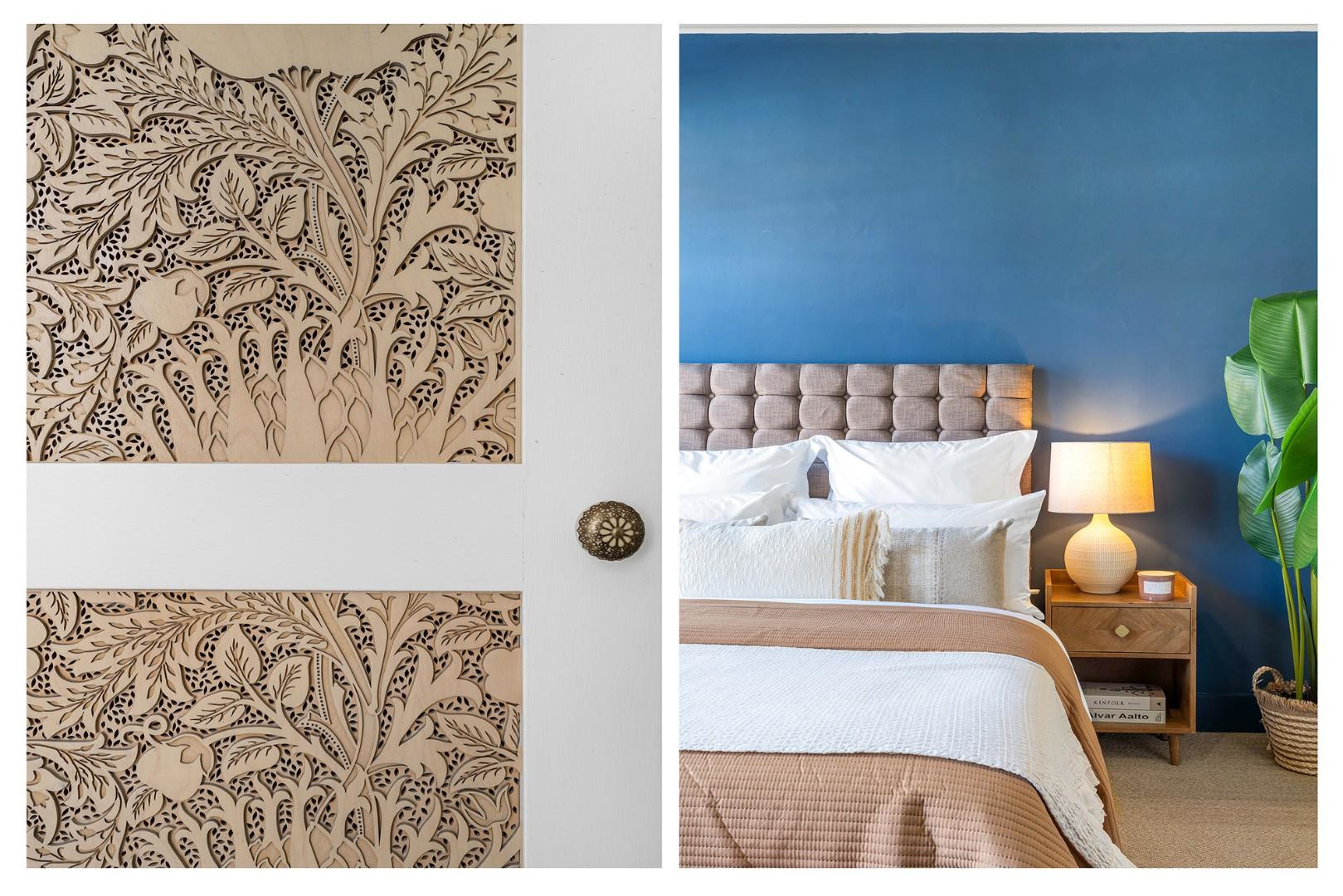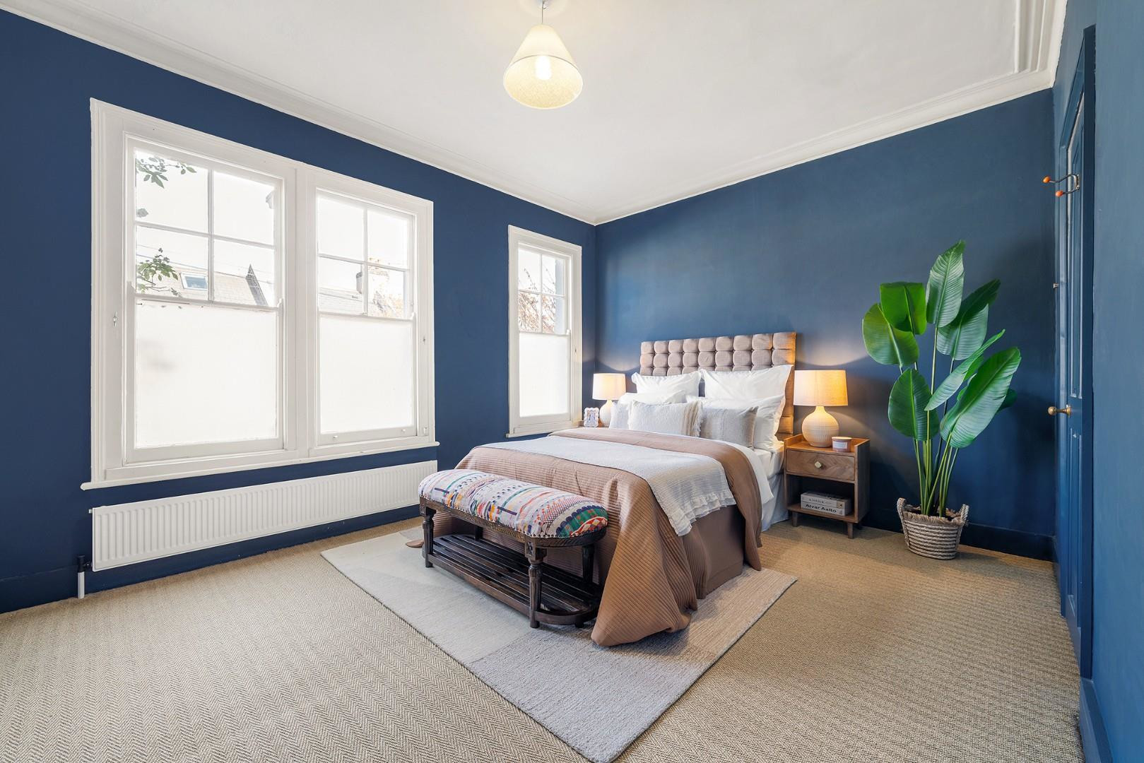 Ascending to the first floor, the principal bedroom spans the full width of the property, offering an elegant and tranquil retreat. Painted in a bold and sophisticated blue, this luxurious bedroom combines period charm with modern comfort. A decorative fireplace acts as a focal point, while bespoke wardrobes have been fitted neatly into the alcoves to maximise storage without compromising style. Multiple sash windows flood the space with natural light, highlighting the soft carpeting underfoot and creating a serene, airy feel.
