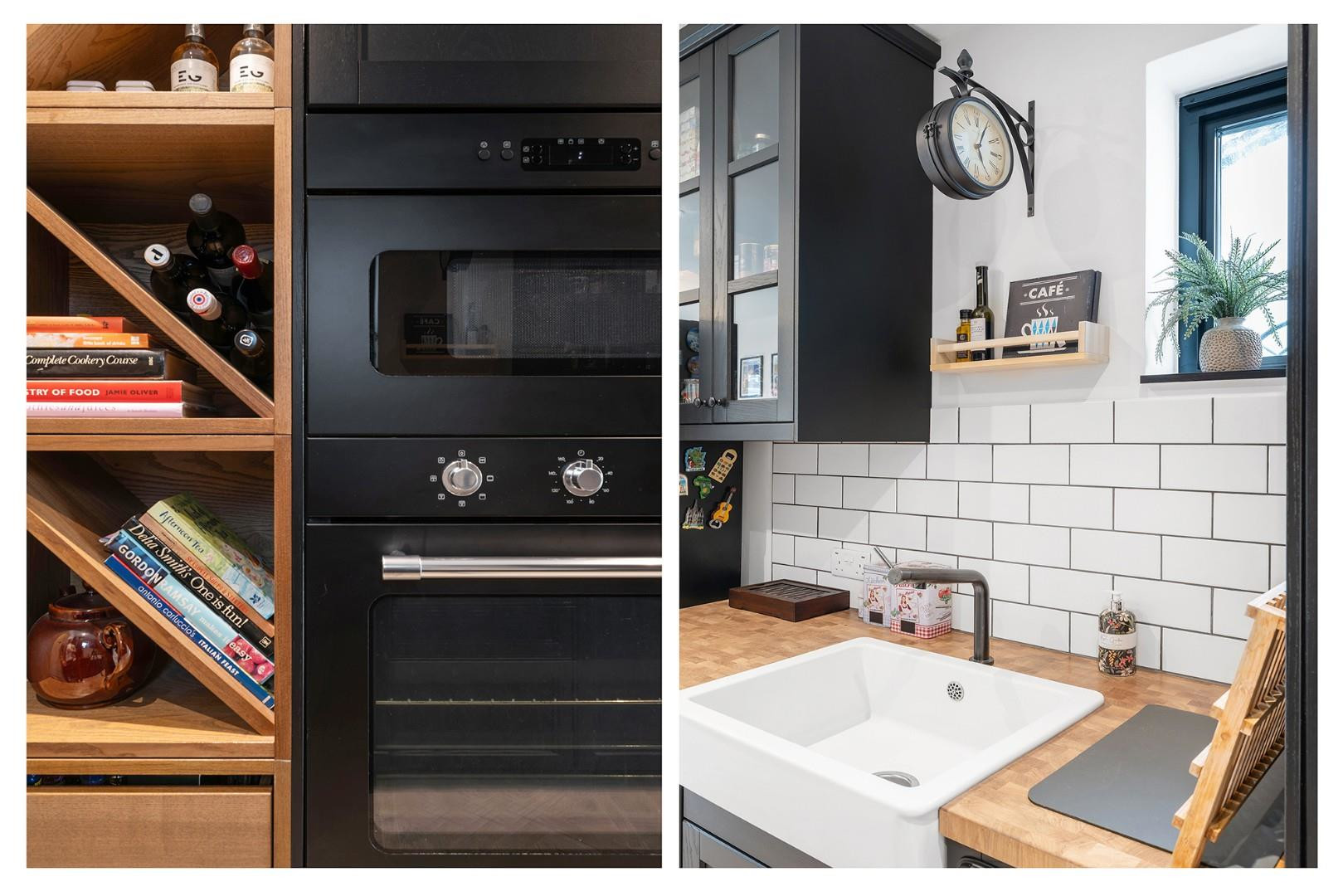 To the rear, the home opens into an impressive open-plan kitchen, dining, and reception area that forms the heart of the home. This sociable and stylish space has been thoughtfully designed for modern living, with bi-fold doors opening directly onto the south-facing garden, allowing light to flood the room and creating an easy flow between indoors and outdoors. The kitchen itself is striking, featuring black cabinetry with sleek worktops, a white subway tile splashback, a traditional butler sink, and fully integrated appliances. This seamless design is complemented by ample space for dining and relaxing, making it ideal for entertaining or family life.