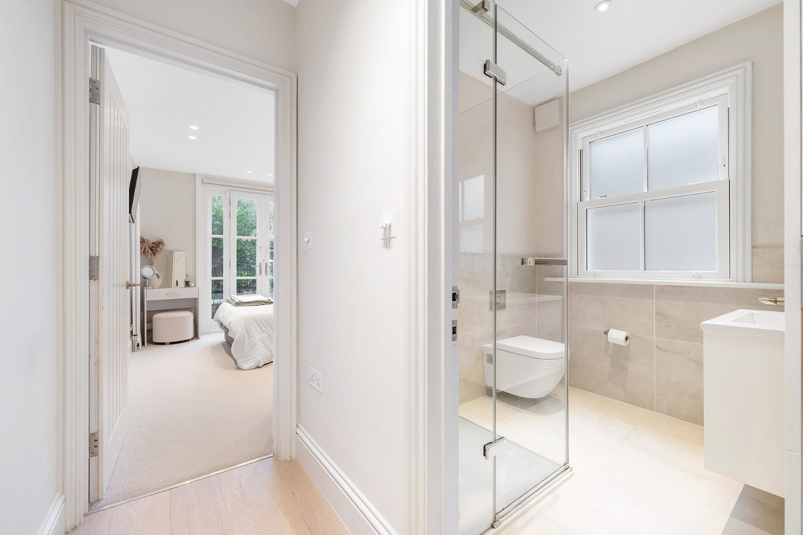 Also located on this level is a beautifully appointed bathroom. Finished to an exceptional standard, it features a walk-in shower with a frameless glass enclosure, a floating enclosed-cistern WC, and a sleek vanity unit with integrated sink. A sash window allows for excellent ventilation and natural light, completing this modern and practical space.