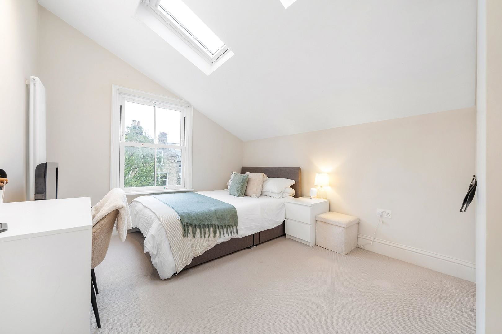 Bedroom three enjoys a peaceful outlook onto greenery through its sash window, with two Velux rooflights ensuring the space remains bright and airy throughout the day. Like the other bedrooms, it features soft carpeting and built-in wardrobes, blending practicality with comfort. Bedroom four is equally appealing, with a large skylight perfect for stargazing and a sash window providing additional natural light. With its generous proportions, it would serve equally well as a guest room, home office, or child’s bedroom.