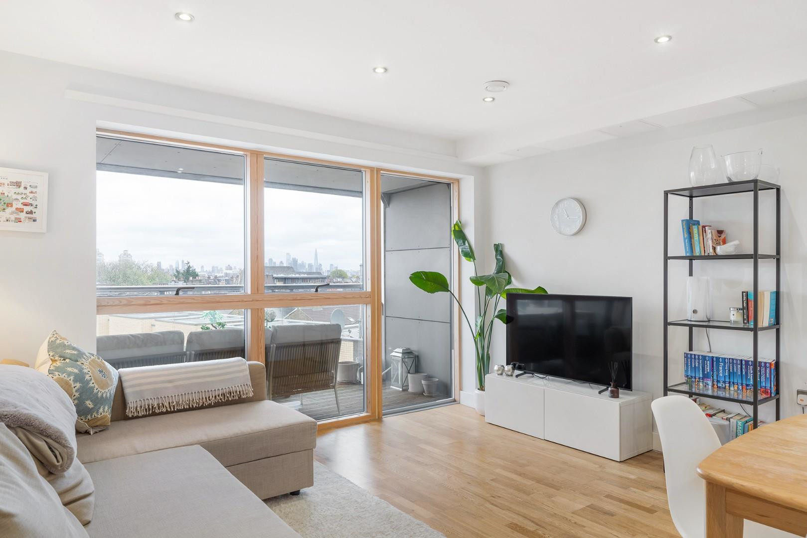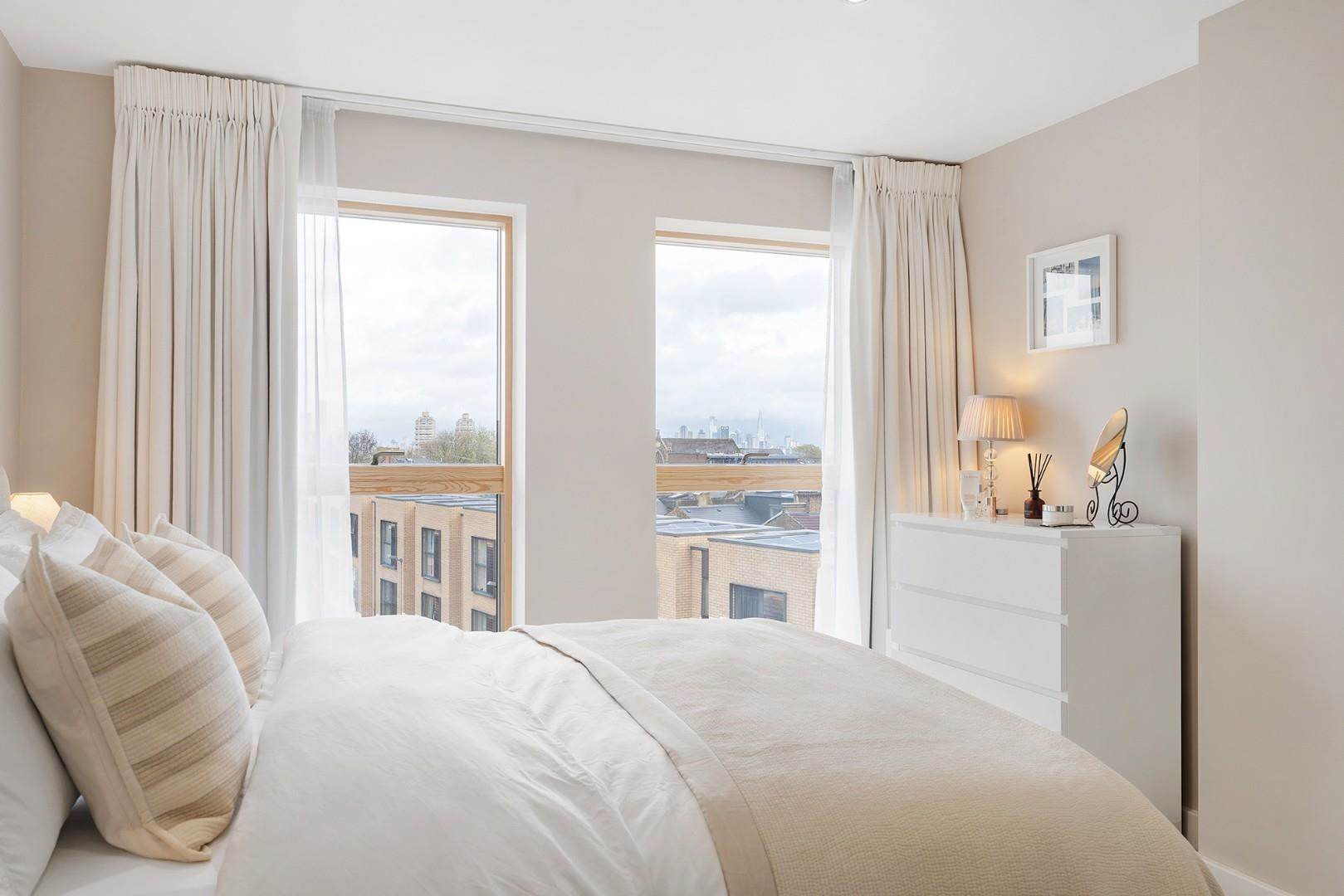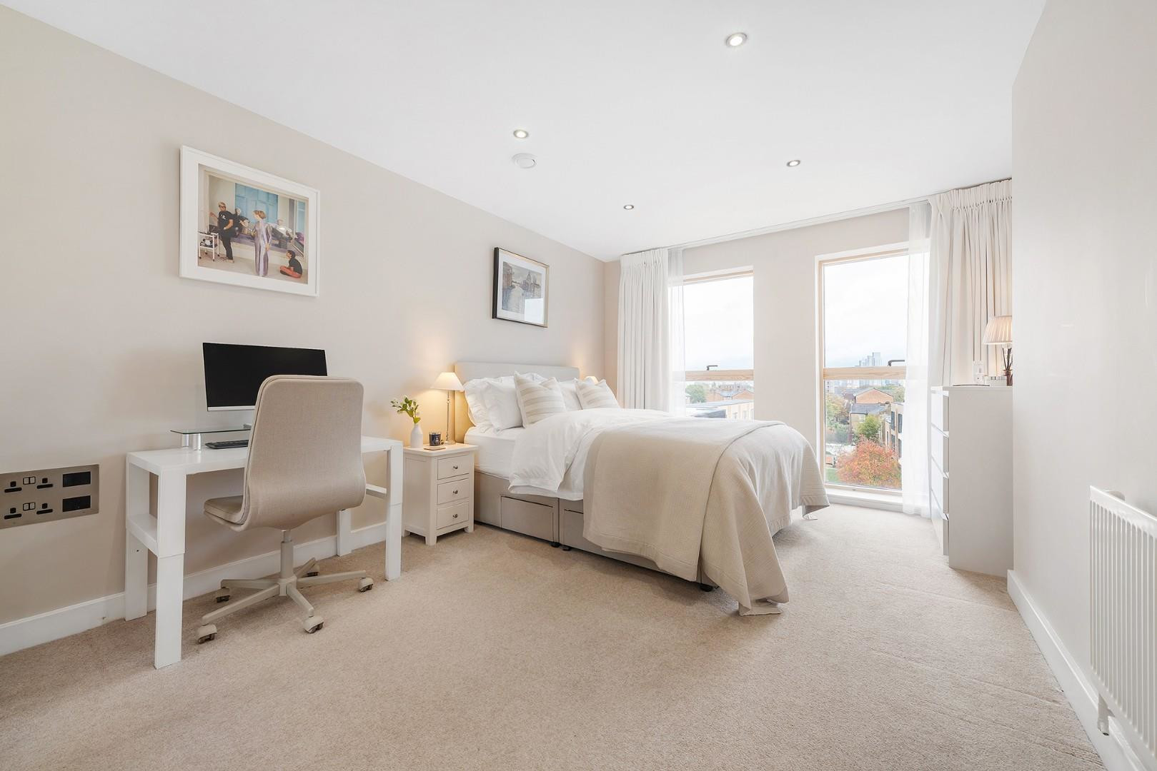 Adjacent, the bedroom boasts the same fantastic views, framed by floor-to ceiling windows, glazed to modern energy standards. This extremely spacious bedroom is a rarity, currently housing a king sized bed and fitted wardrobes whilst still allowing plenty of space for further furnishings. Finished with cosy carpets this tranquil retreat is sheltered from the buzz of Acre Lane even when the windows are open.