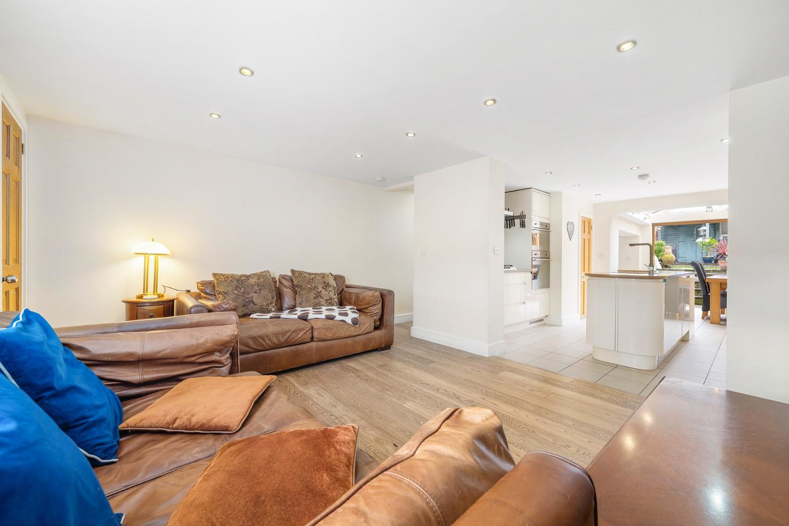The adjoining living area is cosy and inviting, with alcove shelving perfect for books or display pieces. Beyond this, the kitchen flows into a bright dining space beneath a conservatory-style apex roof, where bi-fold doors open onto the landscaped garden, creating a seamless indoor-outdoor connection ideal for summer entertaining.