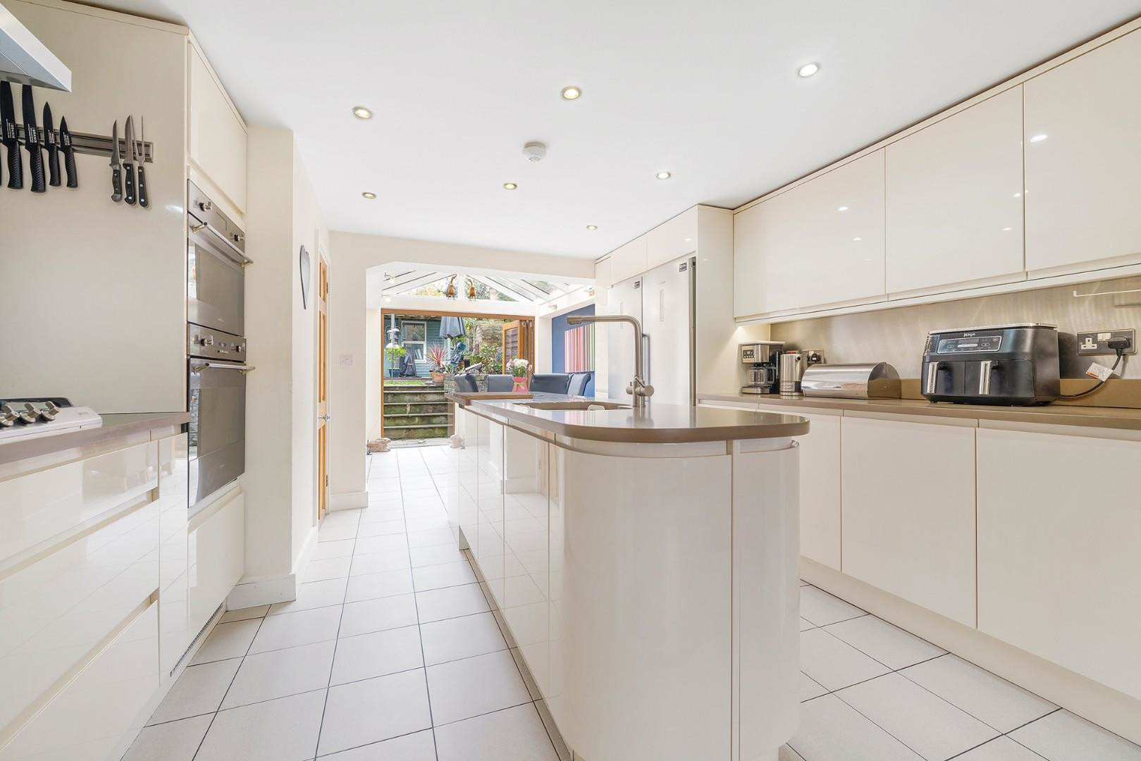 Downstairs, the heart of the home unfolds in an impressive open-plan kitchen, second reception, and dining area designed for contemporary living. The kitchen is finished in sleek cream gloss with handleless cabinetry, offering a clean, modern look. A central island houses the sink and provides generous worktop space, while integrated appliances are neatly built in, leaving ample room for an American-style fridge freezer. A separate utility room adds practical storage and space for laundry appliances, keeping the main kitchen uncluttered.