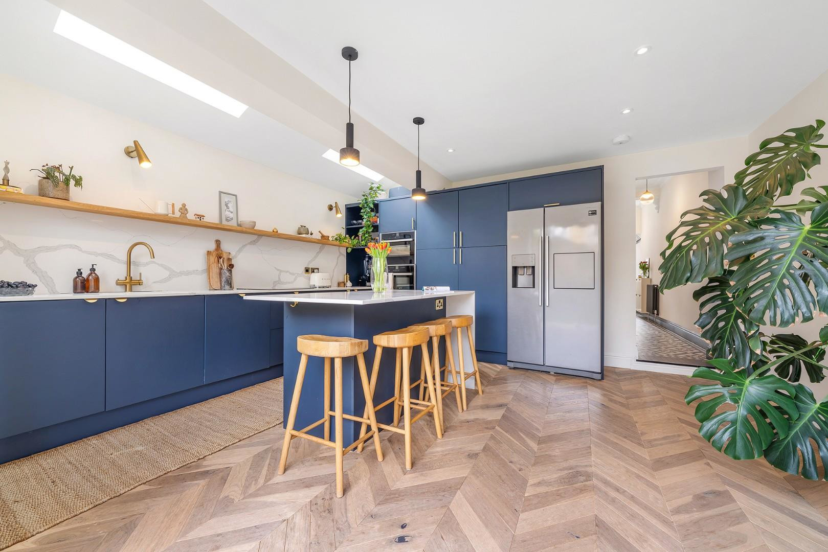 To the rear, the showstopping Valmora Italian kitchen is designed in striking shades of blue, complemented by quartz worktops and premium Neff and AEG appliances. A boiling-water tap, underfloor heating, and oak chevron flooring enhance both comfort and practicality, while aluminium bi-fold doors open seamlessly onto the garden. Floating wooden shelves below the skylights create warmth and texture, and a breakfast bar provides an ideal space for more relaxed dining, elevating the sociable vibe of this fantastic space.