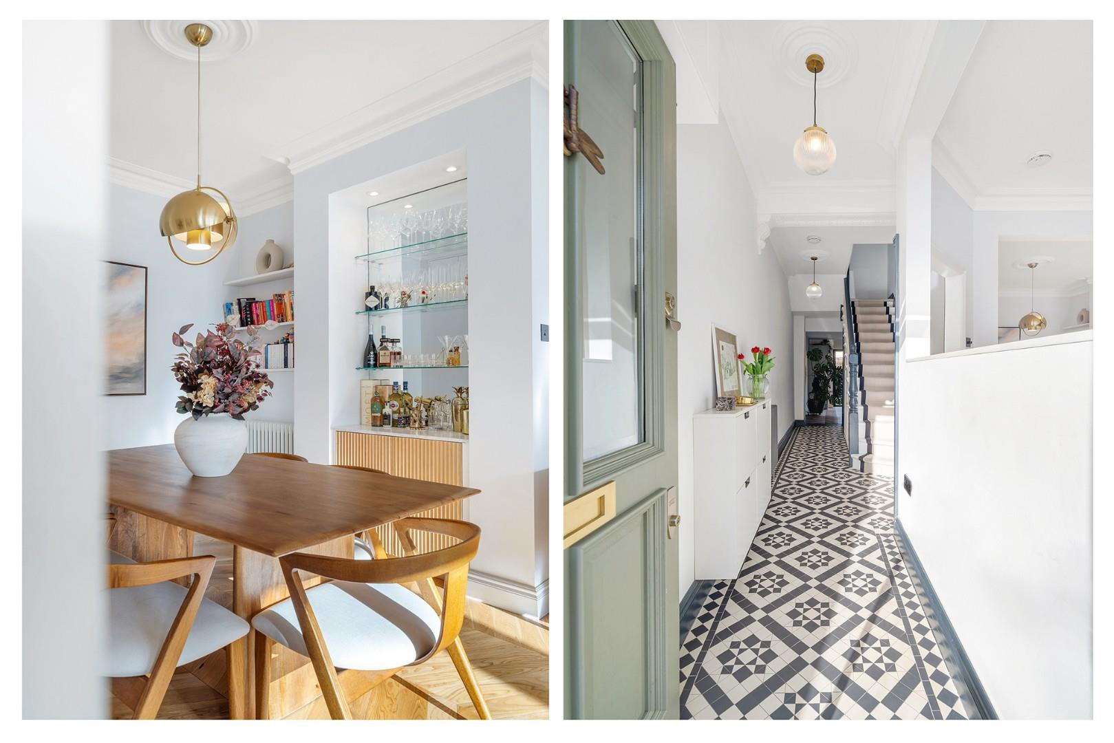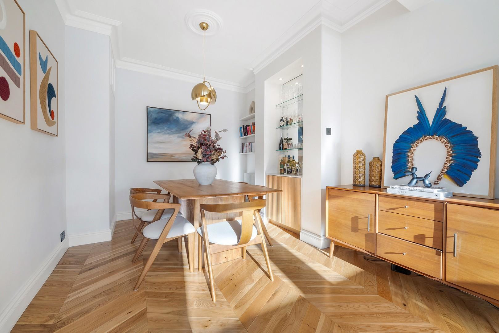 The elegant double reception room sits the front of the home, flooded with natural light through sash windows framed with shutters. Oak chevron flooring flows underfoot, and a gas fireplace provides a focal point, ideal for curling up on winter evenings in front of a cosy fire. The formal dining area, complete with a bespoke bar featuring a marble worktop and glass shelving, offers a perfect setting for entertaining.