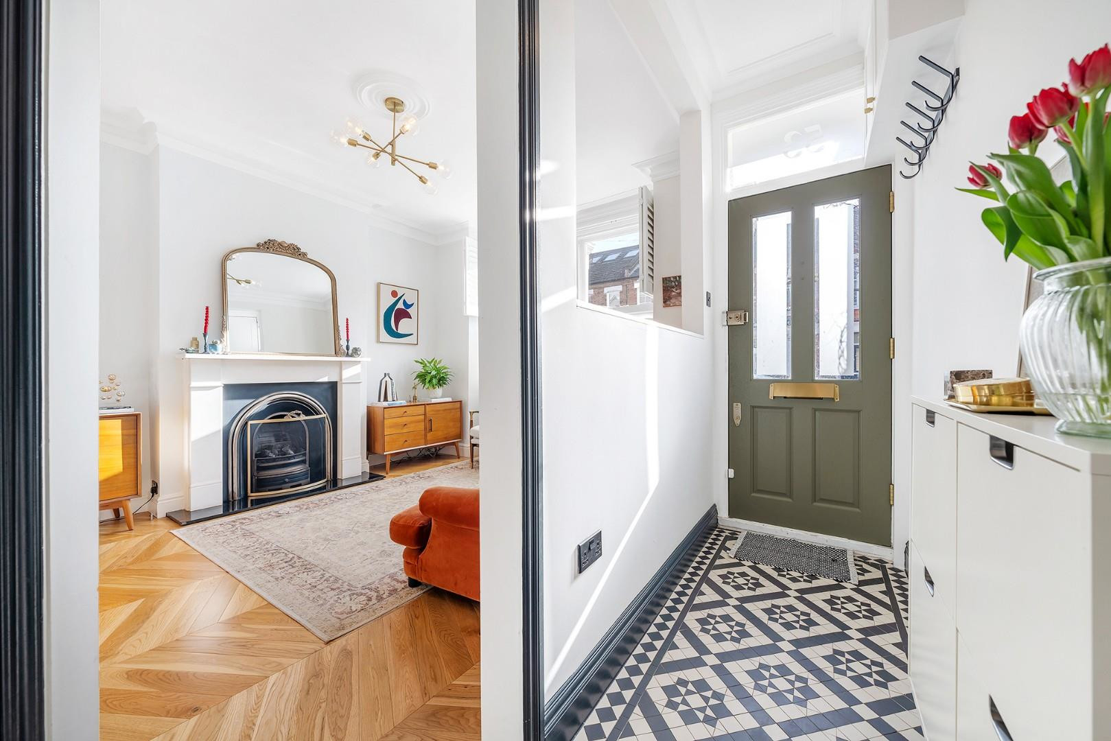 Step inside to a grand hallway boasting original period cornicing, ceiling roses, and monochrome tiled flooring. A runner carpet enhances the staircase, while a guest WC—styled in rich green hues with Burlington fittings—adds a touch of sophistication. Under-stair storage provides practical convenience.