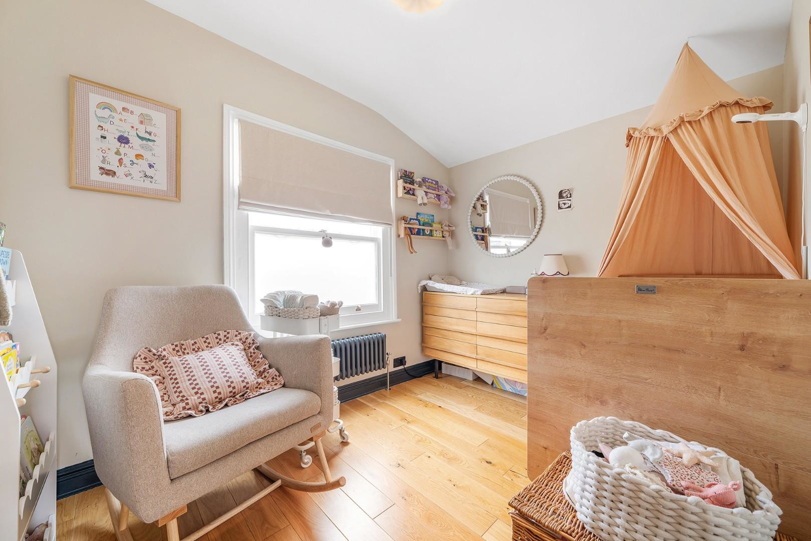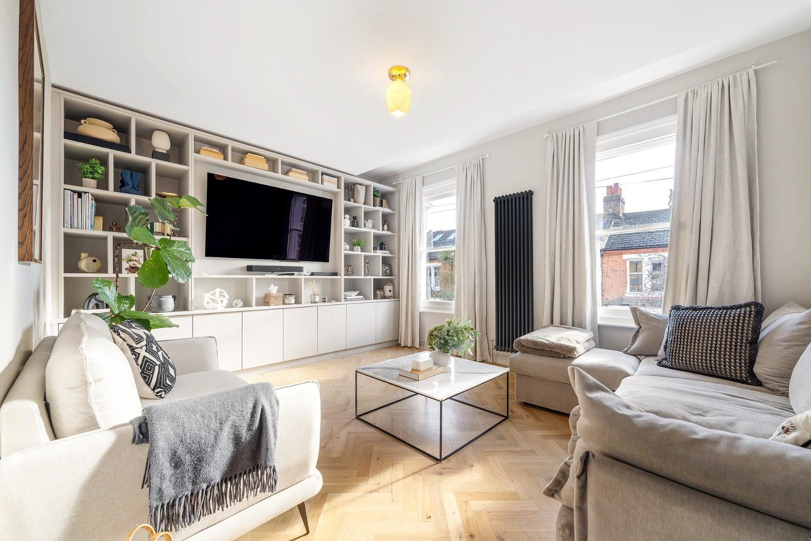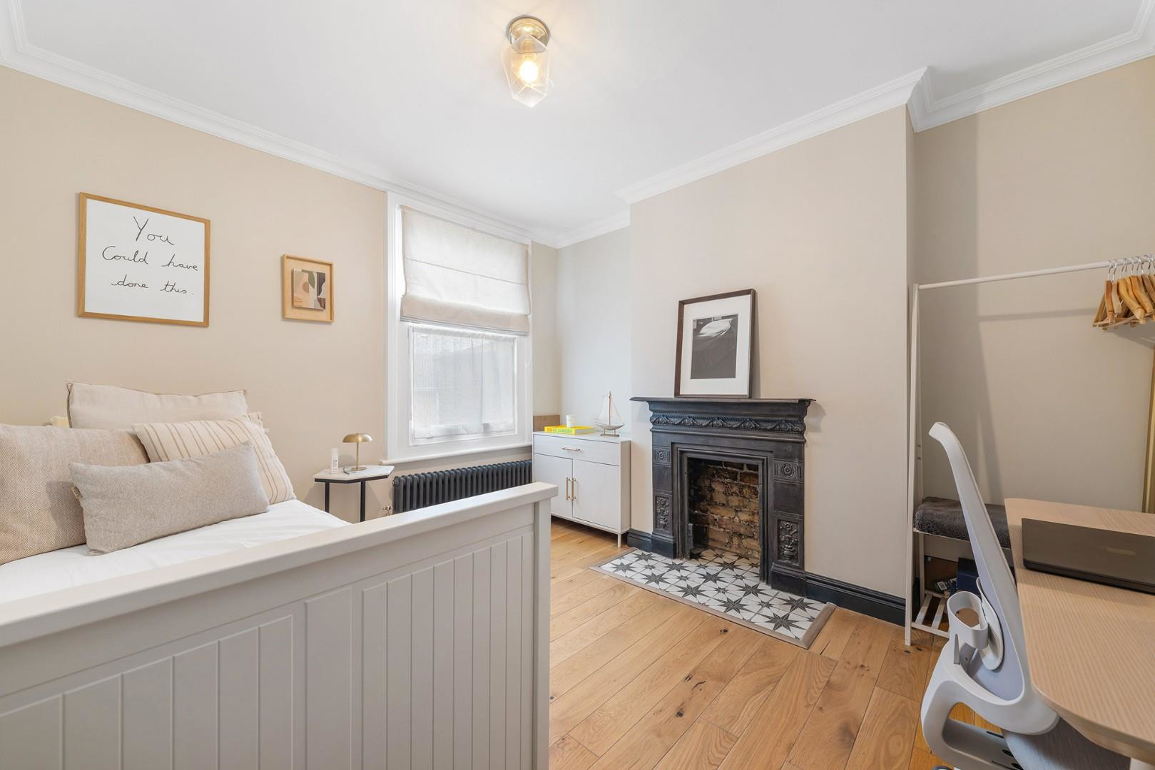 Upstairs, the spacious front room spans the full width of the home with bespoke joinery, shelving, and hardwood parquet flooring. Currently used as a second reception room, it offers flexibility as an additional bedroom. Two further bedrooms on this floor include a stylish home office and guest room, plus a charming child’s room, separated by a luxurious family bathroom with Crosswater fittings, marble surfaces, and a bathtub with overhead shower.