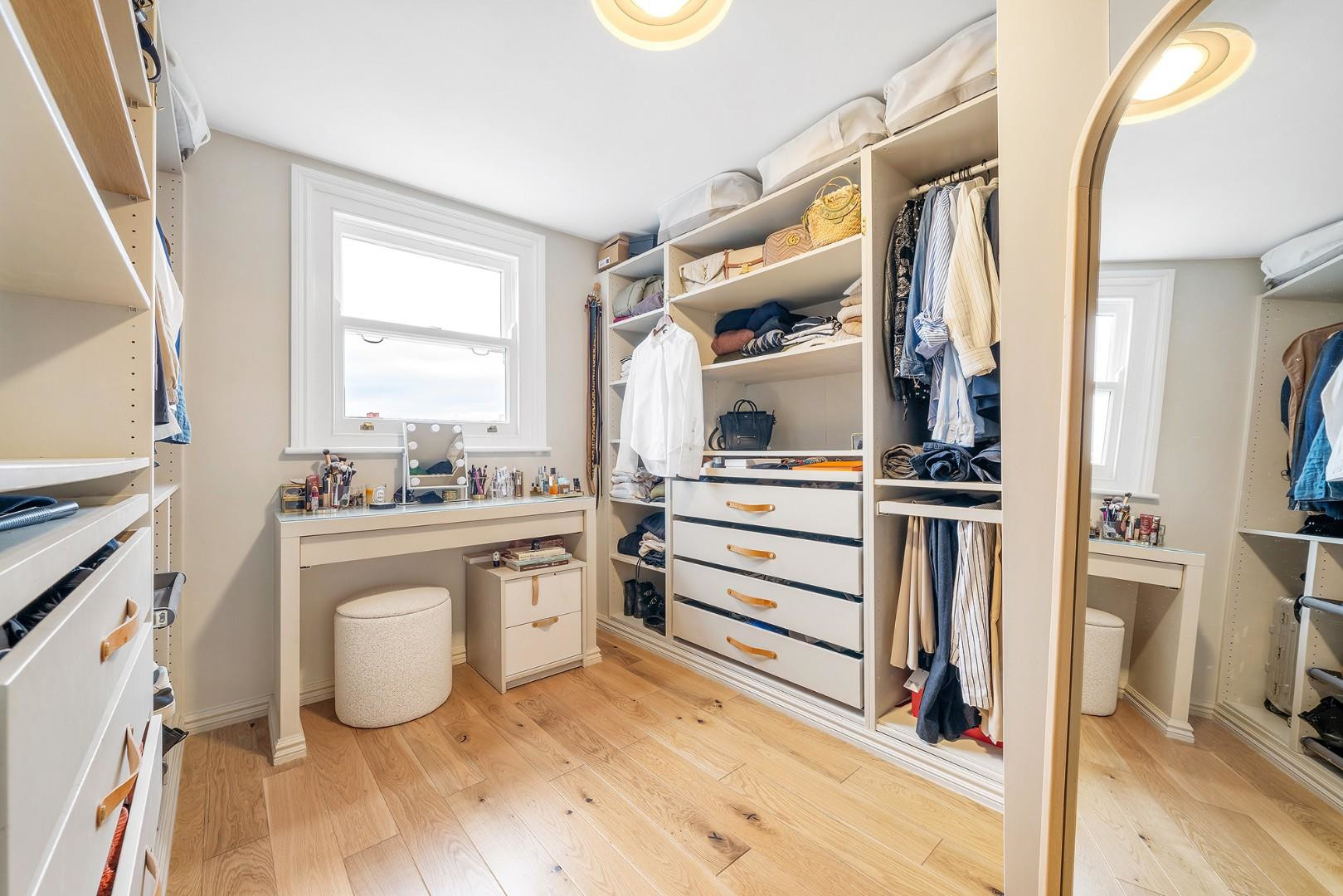 The loft has been converted to create a serene principal suite with engineered wood flooring, three skylights, and soothing neutral tones. The en-suite features a Crittall-style shower screen and Crosswater fittings, while the adjacent fifth bedroom —currently utilised as a dressing room—enhances the sense of indulgence. Additional eaves storage provides practicality without compromising style.
