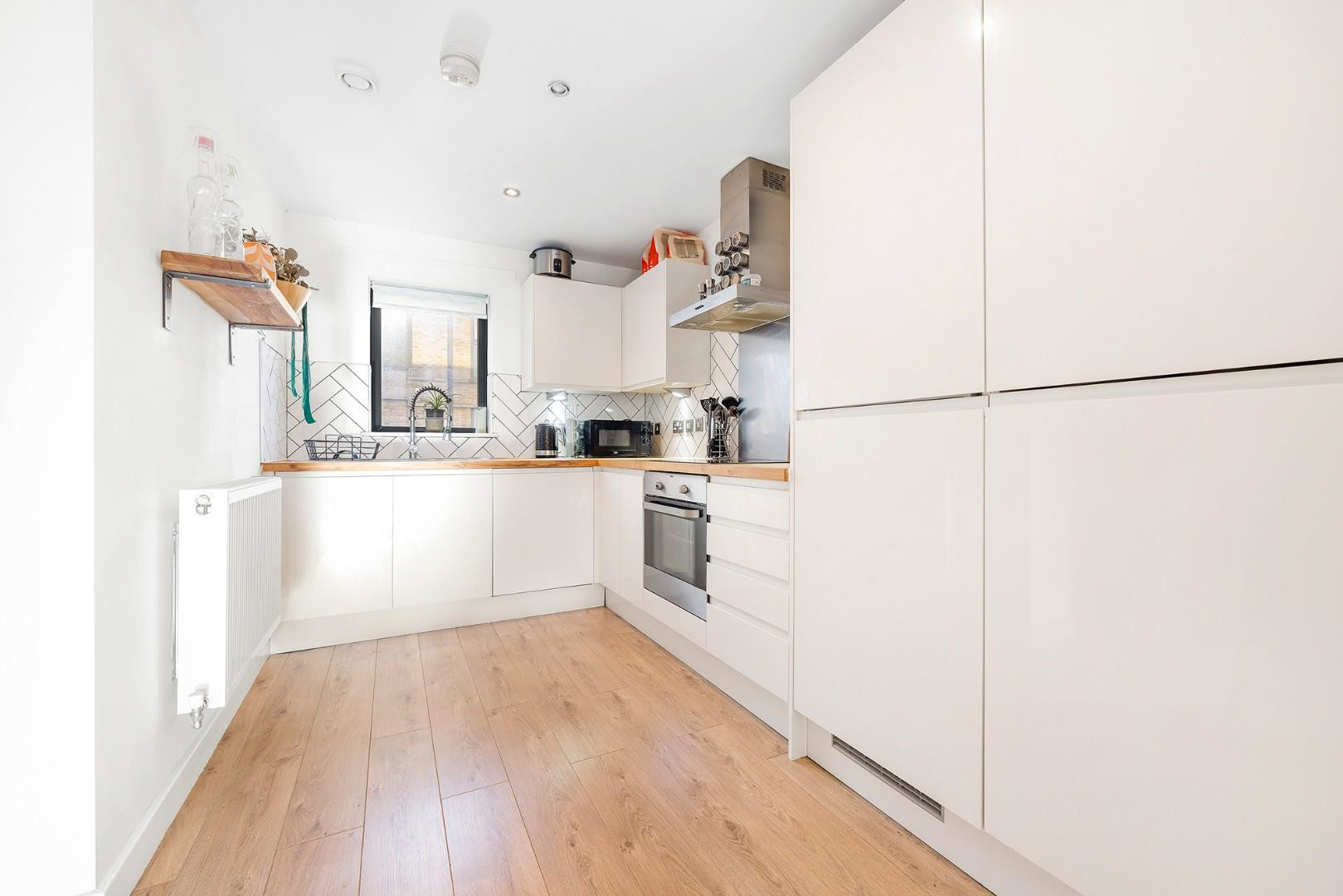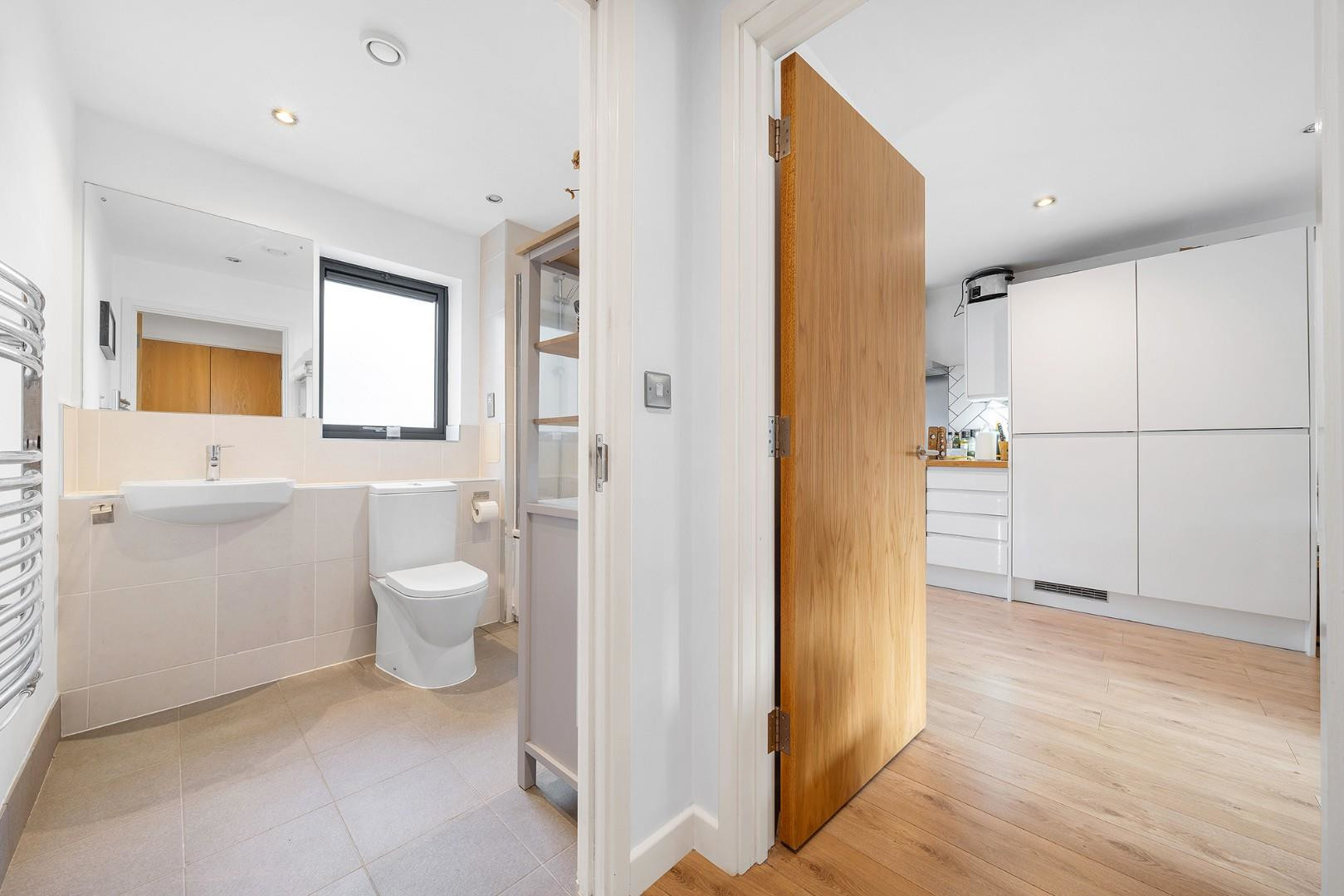 The kitchen is contemporary and thoughtfully designed with white gloss handless cabinetry and solid worktops, creating a sleek, streamlined look. Integrated appliances, including a fridge/freezer and dishwasher, ensure a clutter-free environment and make cooking and entertaining effortless. A window above the sink provides practical ventilation, while the open-plan layout offers ample space to dine, entertain, or simply relax while preparing meals.