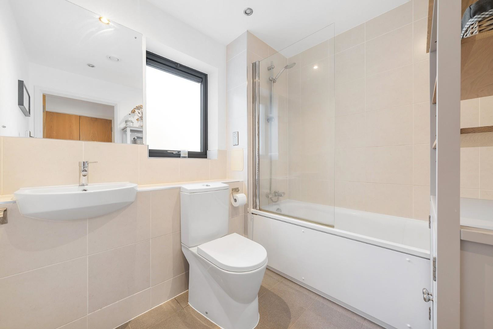 The bathroom features a crisp white suite with a bath and shower overhead, complemented by ceramic tiling and a practical window that ensures excellent ventilation.