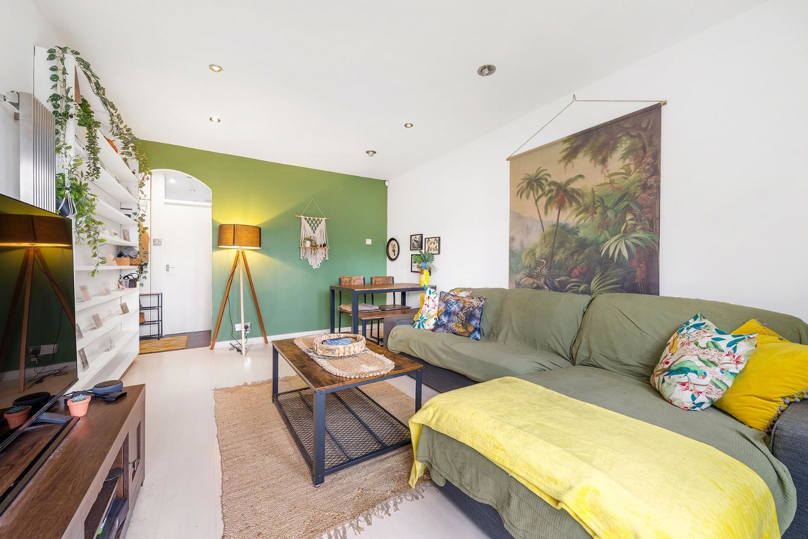 This lovely apartment opens into a welcoming hallway with two useful storage cupboards before leading into a sizeable reception room measuring nearly five metres in length. This impressive living space provides ample room to relax, dine and entertain, enhanced by contemporary downlighting and whitewashed engineered wooden flooring that creates an inviting, airy feel. Large paneled glass doors draw in abundant natural light, opening onto a South-facing Juliette balcony with delightful views across the expansive garden.