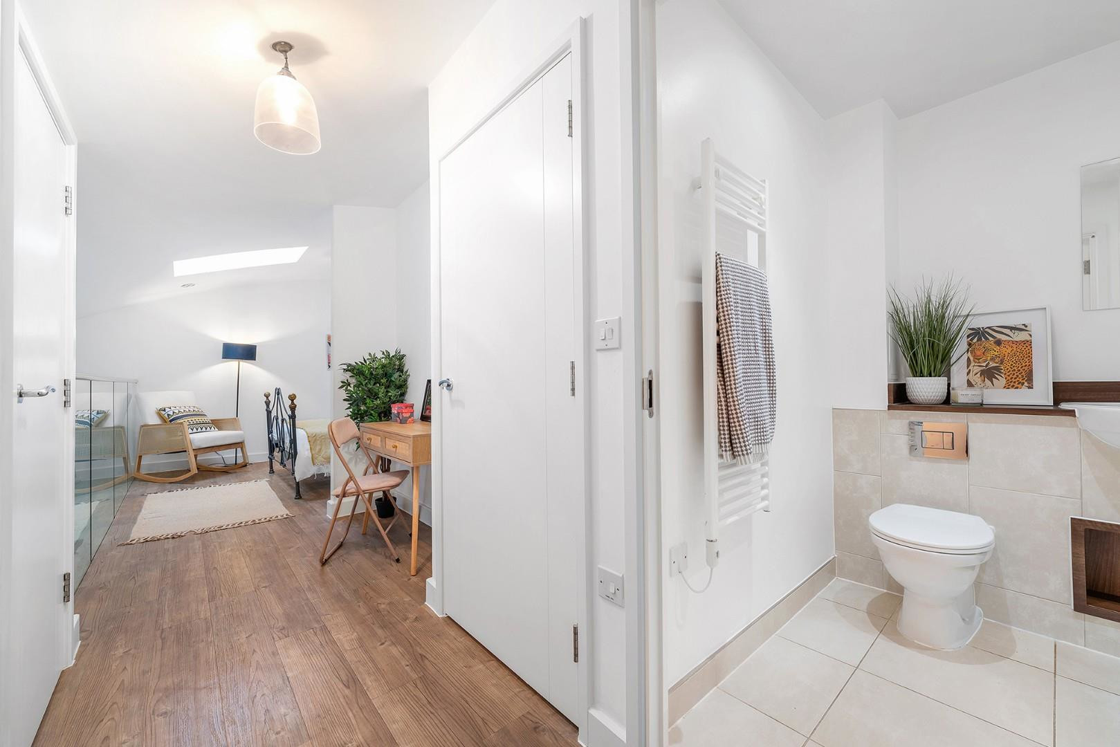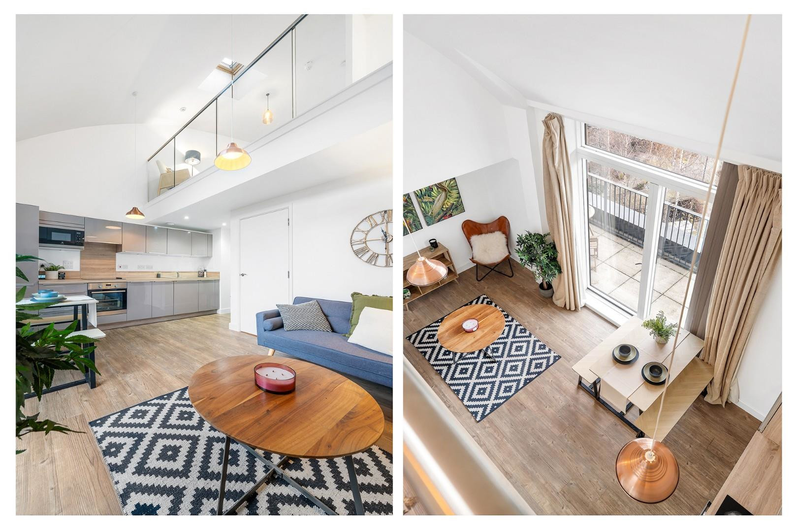 Leading to the mezzanine floor, a landing provides access to a utility cupboard and an alcove ideal for a work-from-home space. The principal bedroom suite occupies the remainder of the mezzanine, a spacious and relaxing retreat featuring a glass balustrade overlooking the reception below and a skylight. The suite is completed by a second bathroom with a walk-in shower. Additional storage cupboards on this floor ensure practical needs are met.