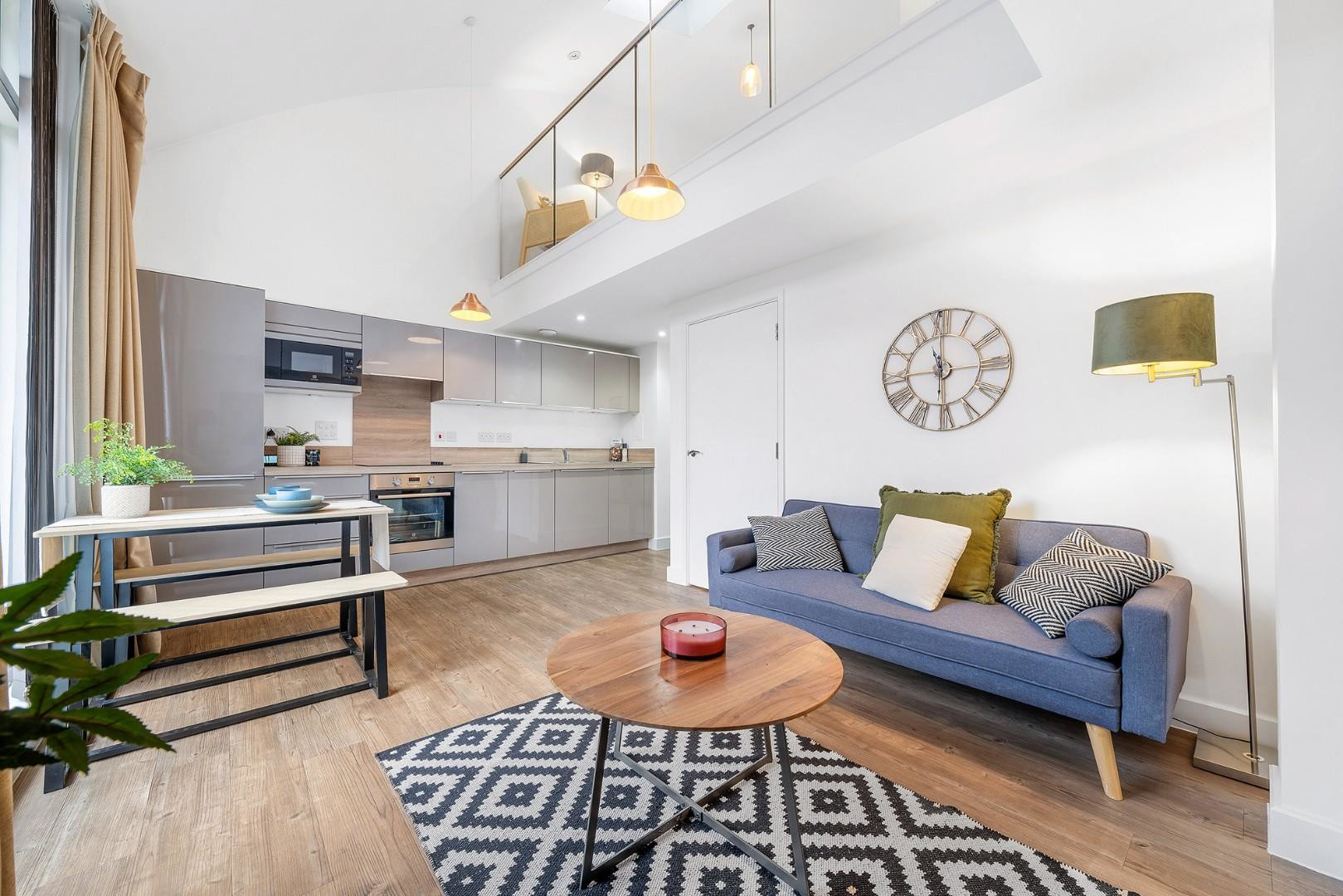 The open-plan reception forms the heart of this appealing home. Bathed in natural light from floor-to-ceiling windows and glazed to the highest modern energy standards, this sociable space offers room to lounge, dine, and cook, with double-height ceilings amplifying the sense of openness. The contemporary kitchen runs along one wall of the reception and is fully equipped with integrated appliances and gloss cabinetry, reflecting light and keeping the space bright and streamlined. Sleek flooring runs throughout the apartment, enhancing its modern aesthetic and flow.