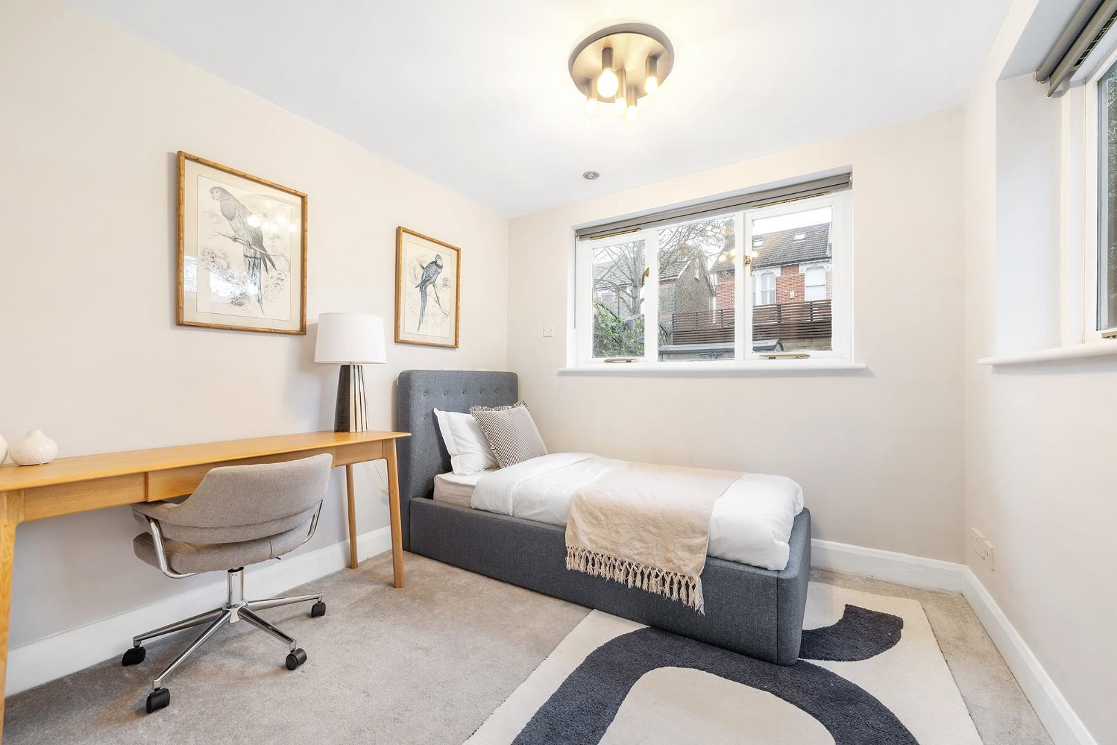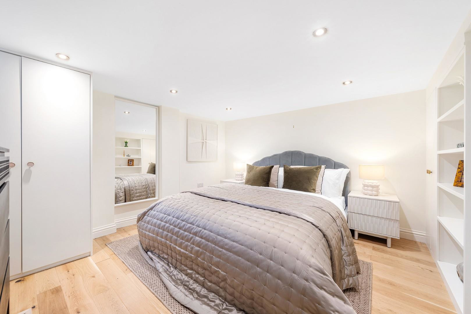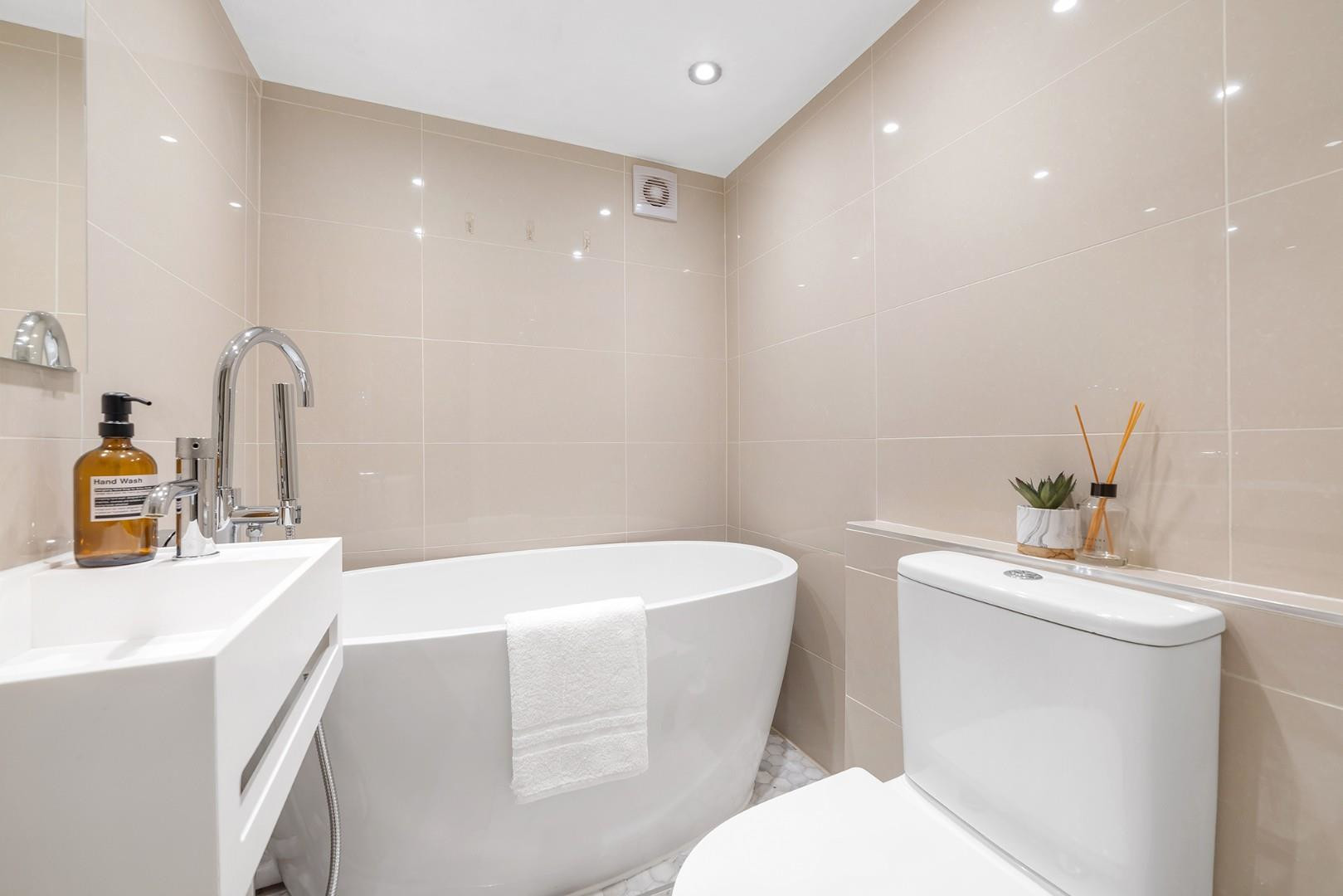 All three bedrooms sit apart from one another, offering welcome privacy for each. The principal is a serene and airy retreat with high ceilings, ornate cornicing, soft neutral tones and a useful wardrobe nook. There is comfortable space for a desk or dressing table, and French windows invite natural light and views to the garden. The second bedroom is positioned downstairs — another spacious double with fitted wardrobes and a tranquil, inviting ambience. Conveniently adjacent lies one of the bathrooms, featuring a free-standing bathtub with swan-neck tap and shower attachment. The third bedroom is set to the rear of the home, with dual-aspect views across the garden, it is an adaptable space with the potential to be re-purposed to suit needs if all three bedrooms aren't required. A second bathroom sits adjacent, appointed with marbled tiling, a bathtub with overhead rain shower and brass fixtures that evoke a calming, spa-like feel.
