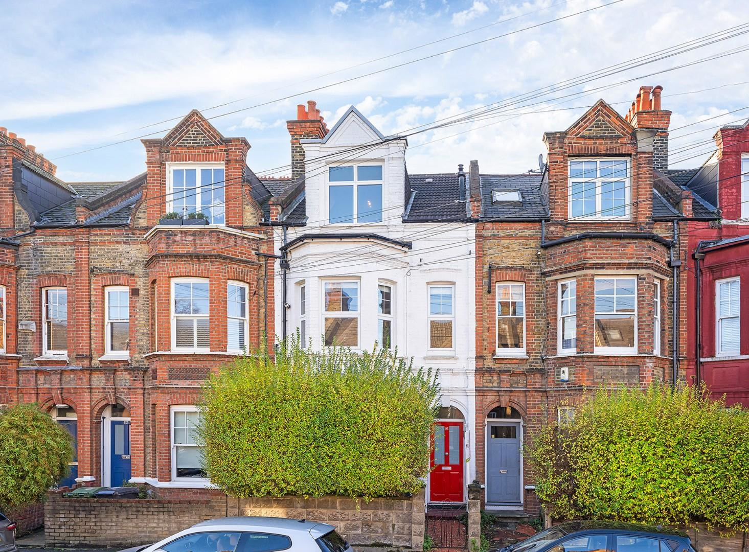 The principal bedroom is located at the rear of the property, offering a peaceful retreat away from the street. Painted in a deep blue tone, the room feels calm and relaxing, with leafy green outlooks enhancing the sense of tranquillity. The second double bedroom sits adjacent to the reception room and enjoys a large window with pleasant views over greenery.