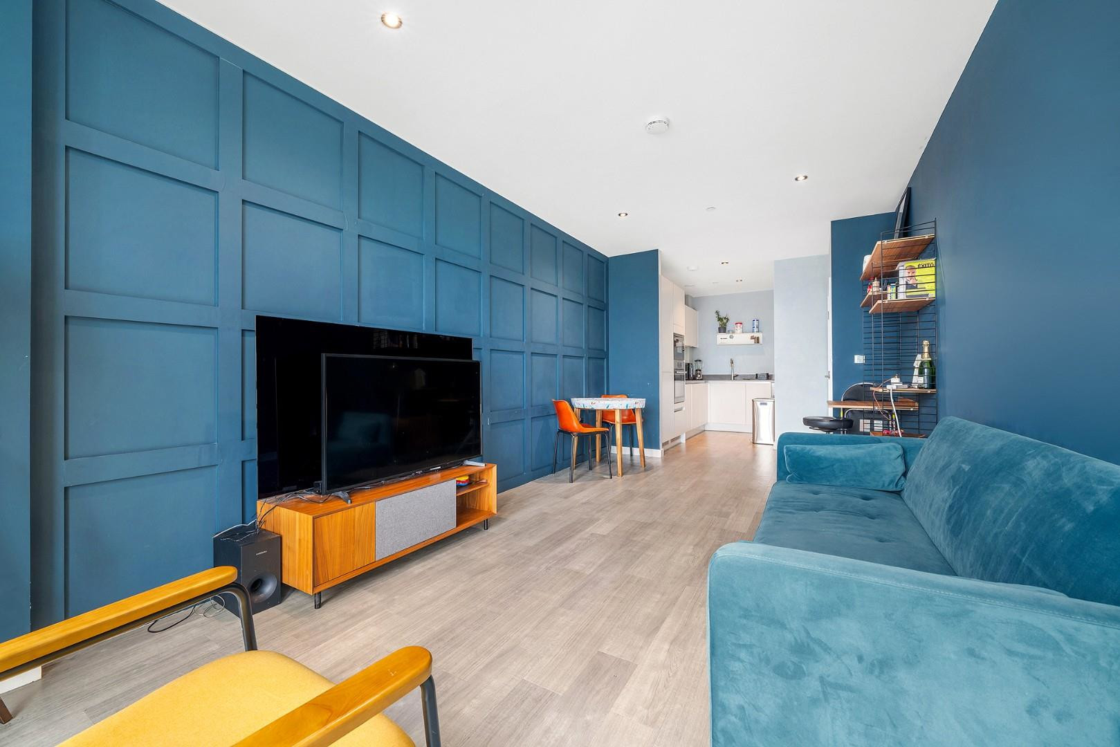 The open-plan reception room is the heart of the home, bathed in natural light from floor-to-ceiling windows and a full-height glazed door that leads directly onto the private terrace. Painted in a sophisticated deep blue and complemented by a stylish panelled feature wall, this beautifully curated space offers an elegant backdrop for everyday living. Whether relaxing on the sofa, hosting friends, or working from home, the room feels effortlessly comfortable and uplifting. The private terrace extends the living area outdoors, providing an inviting spot for morning coffee, fresh air, or quiet evenings overlooking the landscaped communal grounds below and striking city views.