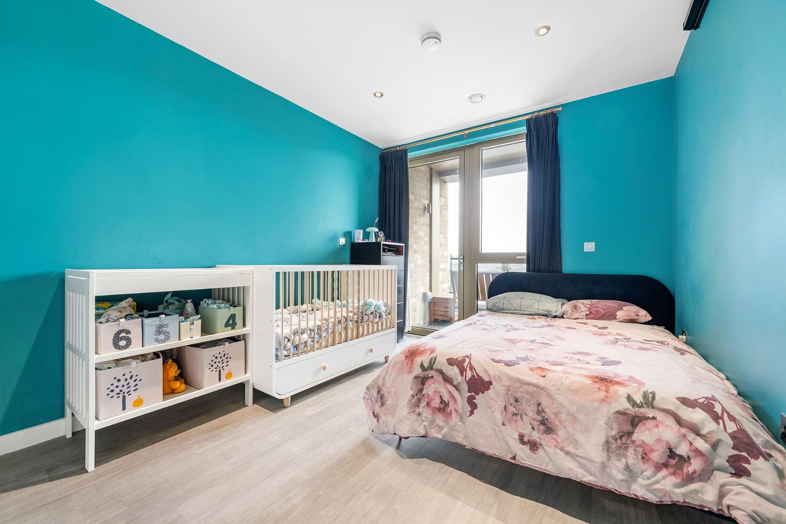 The double bedroom is a peaceful sanctuary, featuring a large window and a glazed door that opens directly onto the private balcony, allowing natural light to pour in and giving the room a calm, refreshing feel. A fitted wardrobe provides generous storage while maintaining sleek, uncluttered lines.
