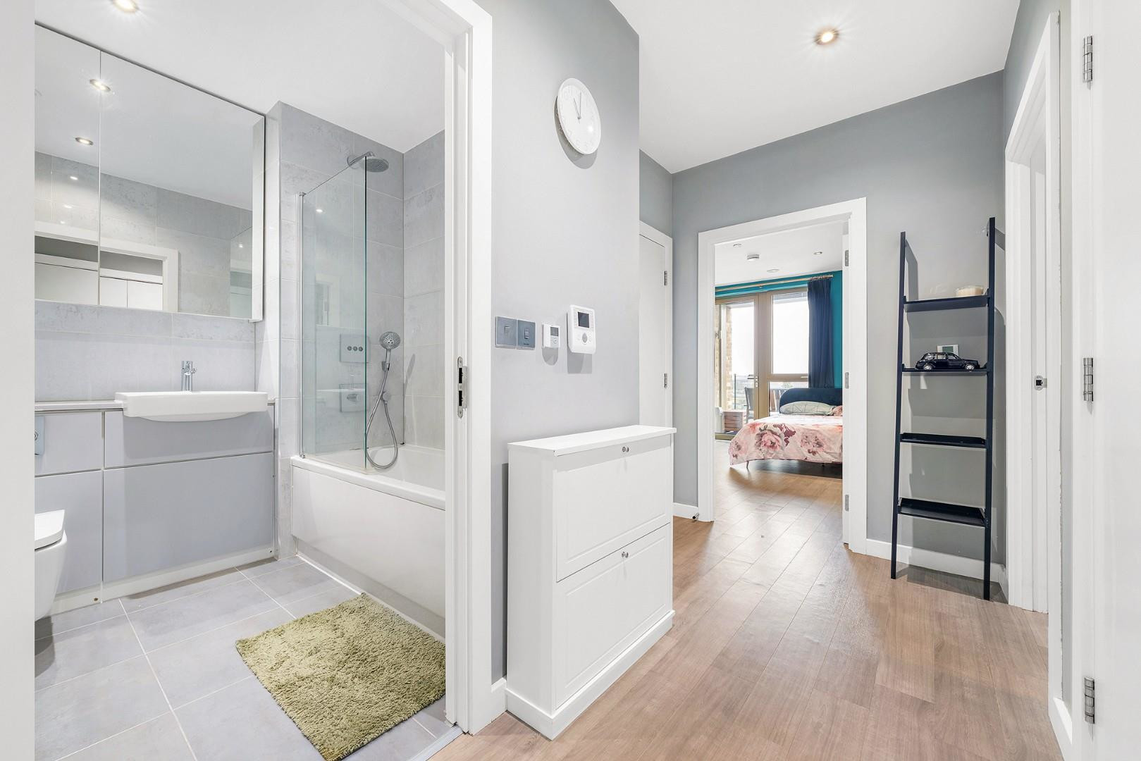 Karndean flooring flows seamlessly throughout the apartment, while underfloor heating with individual heat meters ensures a warm and energy-efficient environment all year round. A utility cupboard in the hallway adds convenient storage space for household essentials.