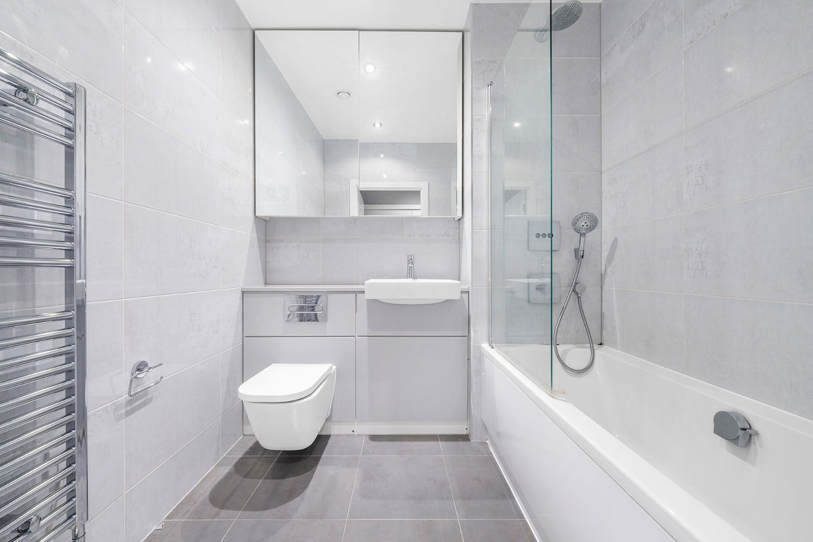 The bathroom is finished to an excellent specification, featuring a crisp white suite with ceramic wall and floor tiling. A thermostatically controlled shower sits over the bath, paired with a Hansgrohe mixer tap and matching shower handset. Practical additions such as a heated chrome towel rail and a mirror-fronted cabinet above the washbasin enhance both functionality and style, creating a smart, modern space with a luxurious feel.