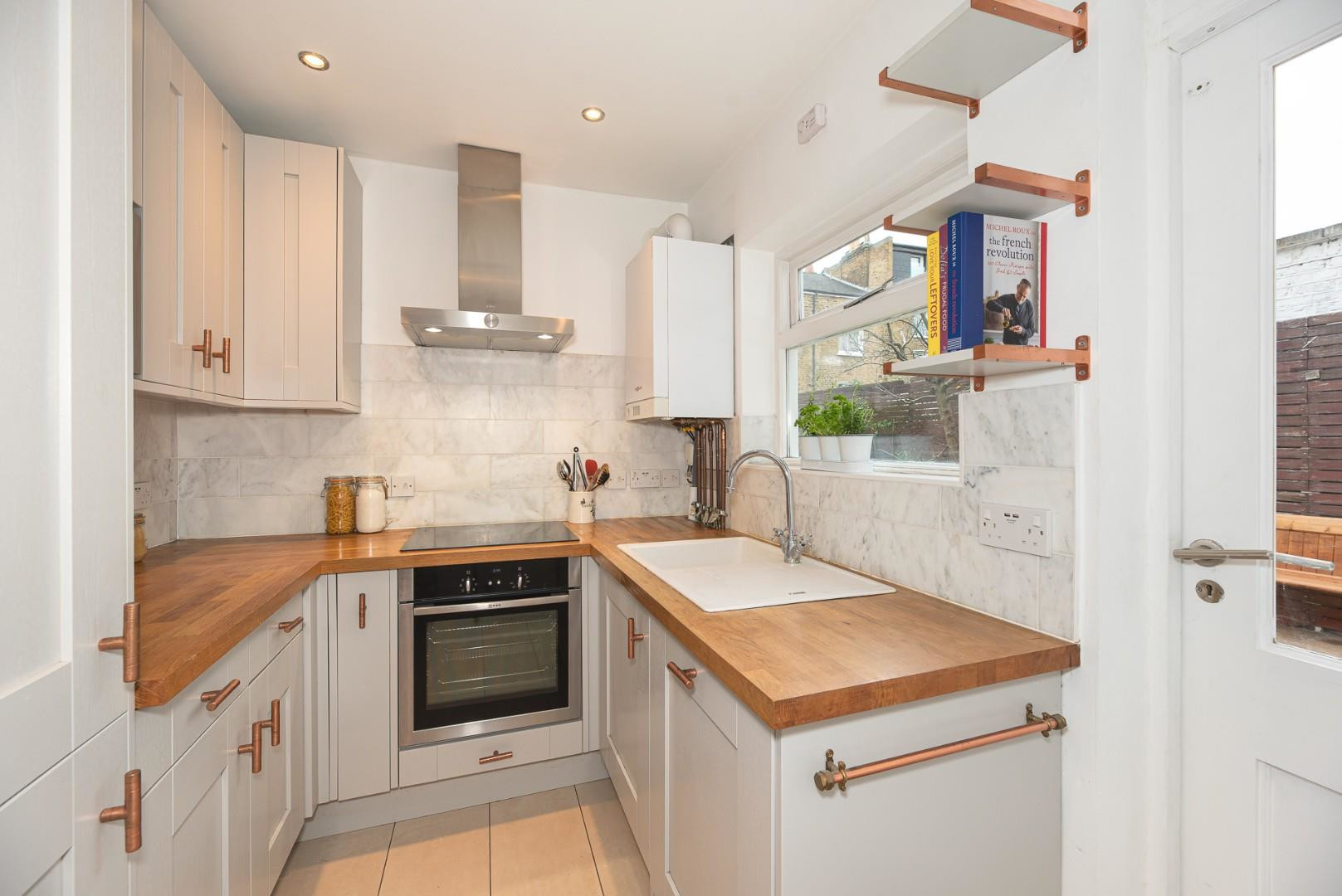 A private front door opens into a welcoming entrance hall, leading up a short flight of stairs to the substantial reception. Bathed in natural light from the elegant bay window and enhanced by high ceilings, this impressive room extends over five metres, providing an abundance of space to relax, dine and entertain. The separate kitchen enjoys a delightful country aesthetic, with wrap-around shaker cabinetry and wooden worktops maximising practicality and workspace. Integrated appliances include a full-size fridge-freezer and dishwasher, while a window above the sink brings in further light. Perfect for hosting or al-fresco dining, a patio door leads directly from the kitchen onto the paved terrace and out to the garden beyond.