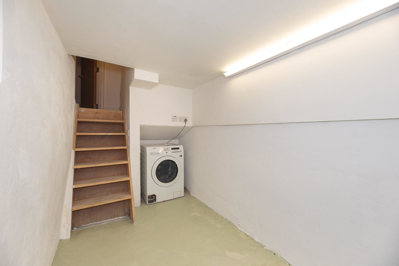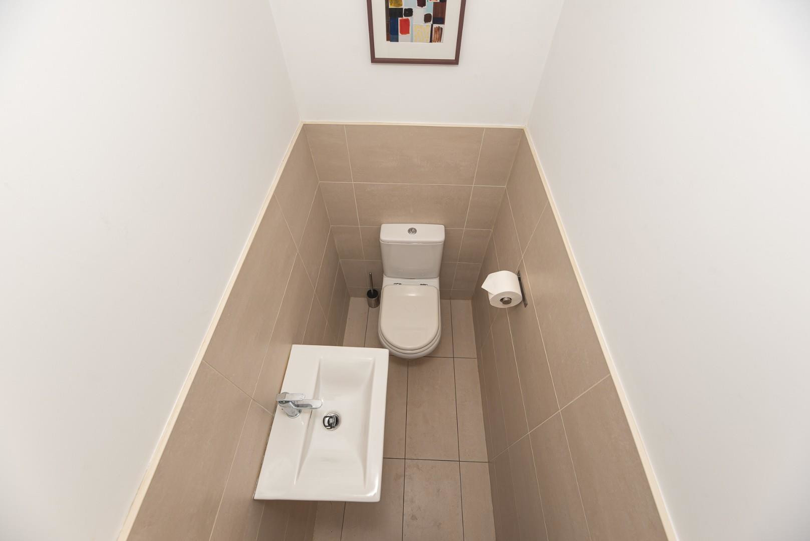 A neutrally finished bathroom with large-format tiling and a bathtub with overhead shower sits between the reception and the principal bedroom. Additional conveniences include a separate WC off the entrance hallway and a cellar providing valuable storage.