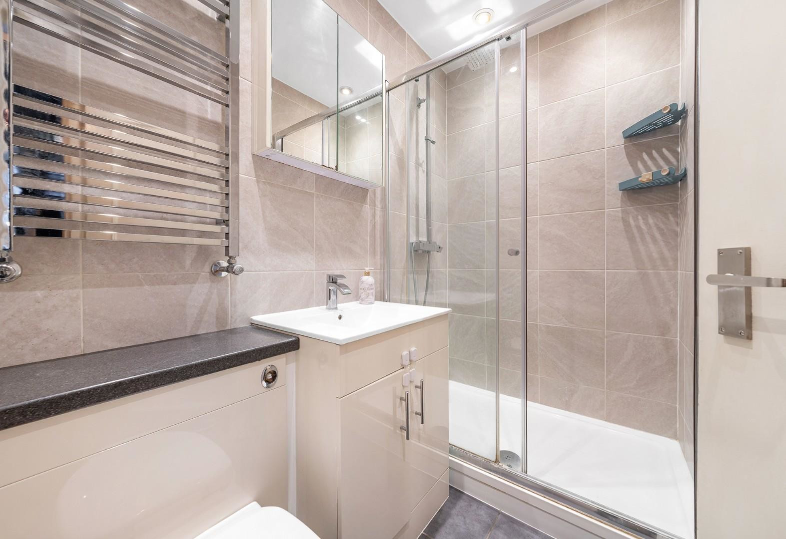 The principal bedroom is quietly positioned at the rear of the property, providing excellent separation from the main living areas. Located down a small set of stairs, it benefits from added soundproofing for ultimate privacy and tranquillity. A frosted sash window fills the room with soft light, while plush carpeting and shelving in the alcove create a cosy and versatile space. Adjacent to the principal bedroom is the bathroom, featuring a large walk-in shower with a rainfall showerhead, a modern vanity unit under the sink, and a heated towel rail, combining comfort with contemporary style.