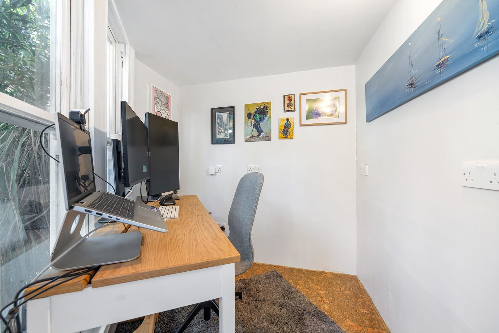 The principal bedroom is located at the rear of the ground floor and is an impressive and tranquil space. Extended to create a dedicated work-from-home nook, this area could also be used as a dressing area, offering flexibility to suit individual needs. A skylight and French doors allow natural light to pour in, enhancing the calm, neutral décor. Built-in wardrobes provide excellent storage, while a decorative fireplace mount adds character. The French doors lead directly out to the private South-east facing garden, reinforcing the sense of retreat.