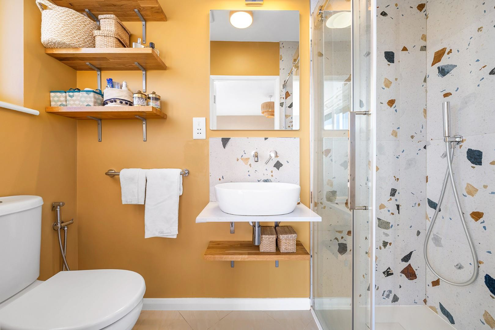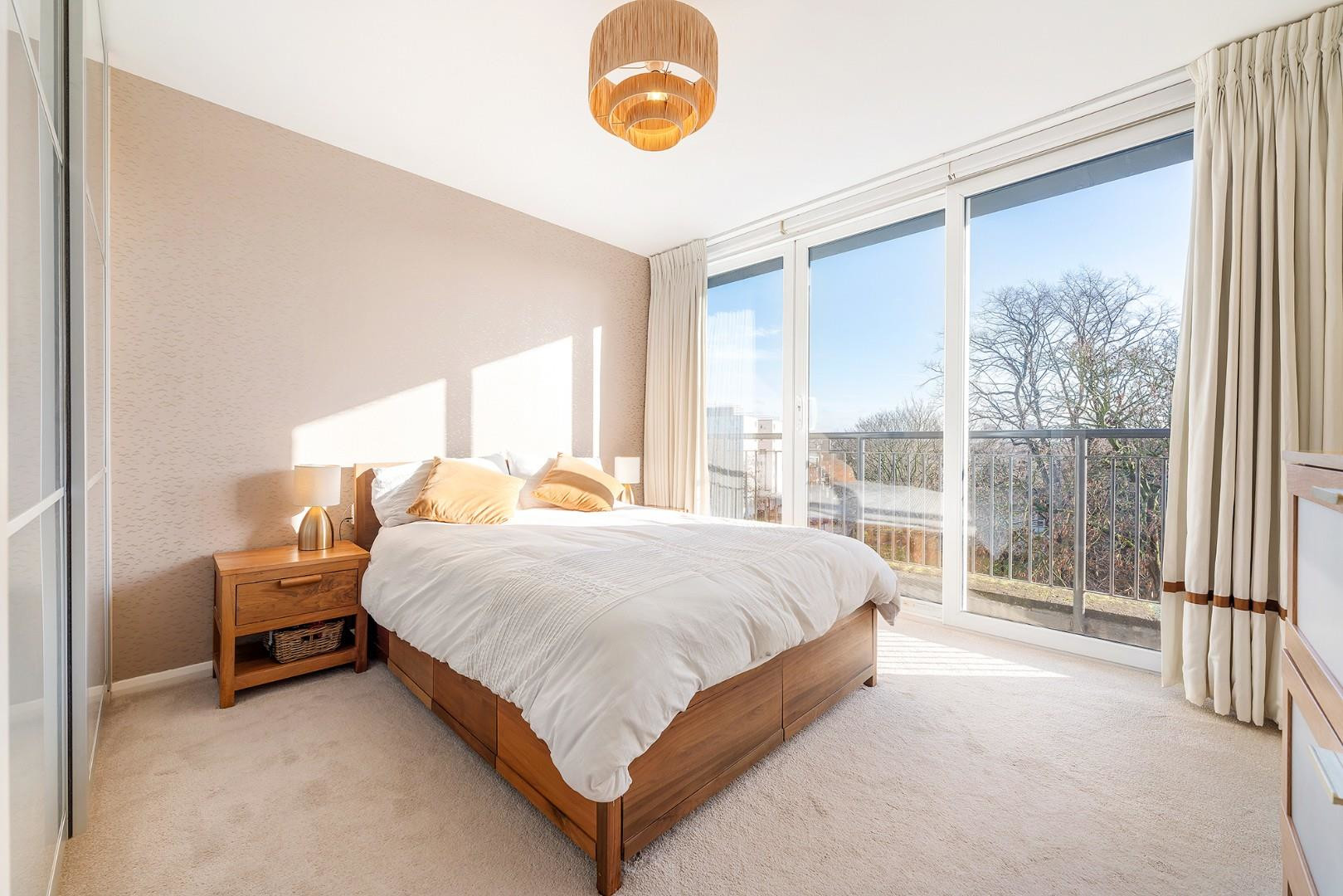 Both bedrooms are generous double rooms, each benefiting from bespoke built-in wardrobes and soft carpet underfoot. The principal bedroom is especially impressive, featuring its own Juliet balcony, floor-to-ceiling windows, an air conditioning unit, and a beautifully appointed en suite bathroom. The en suite has been fully renovated to a high specification, with a shower cubicle and elegant terrazzo-style tiles, and includes a window for natural ventilation. The second bedroom is quietly situated to the rear of the property and offers a versatile space that could equally serve as a guest room or home office if both bedrooms are not required.