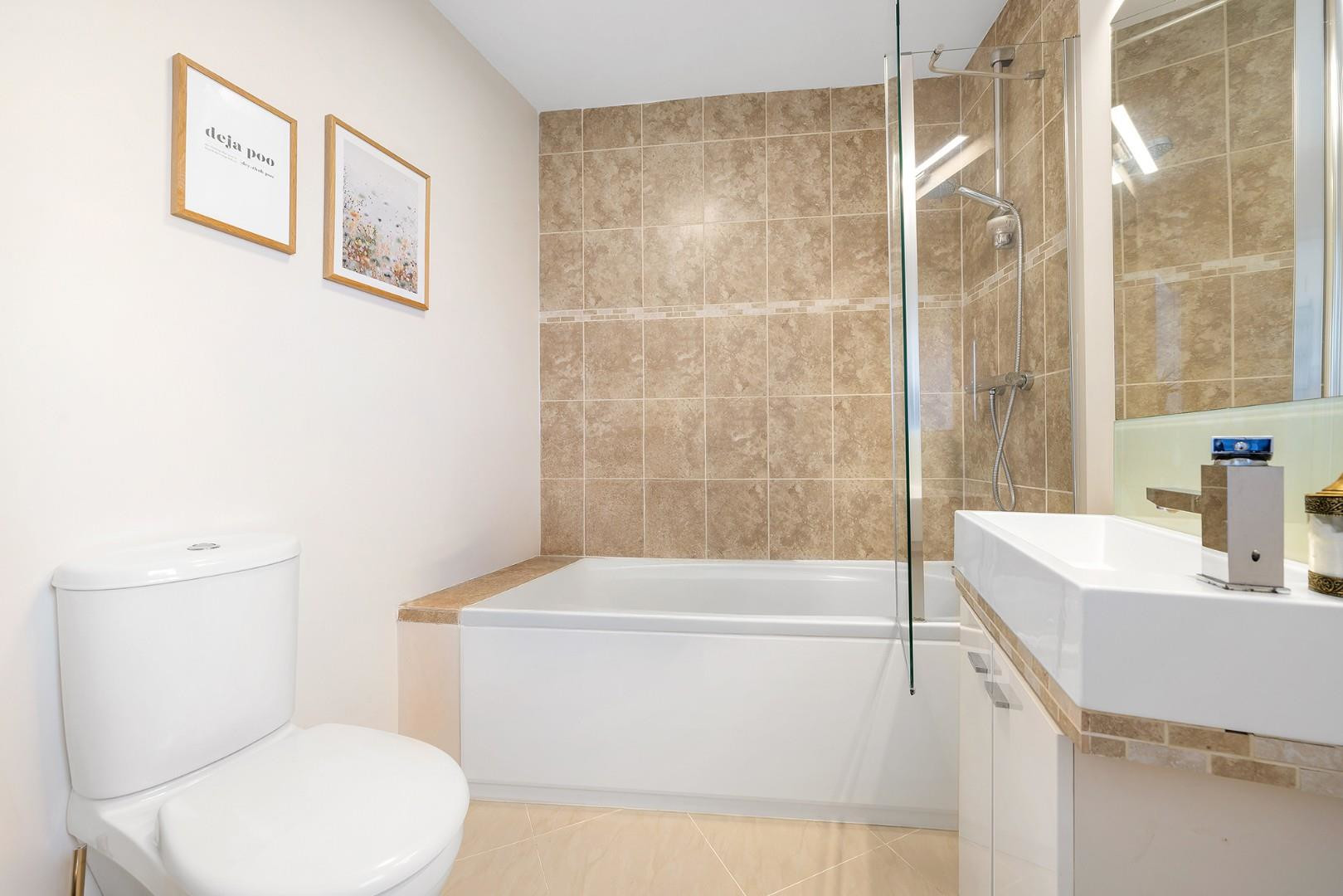 The family bathroom is neutral with a clean and modern finish and includes a shower over the bath, ideal for relaxing after a day exploring the local area or enjoying nearby Brockwell Park.