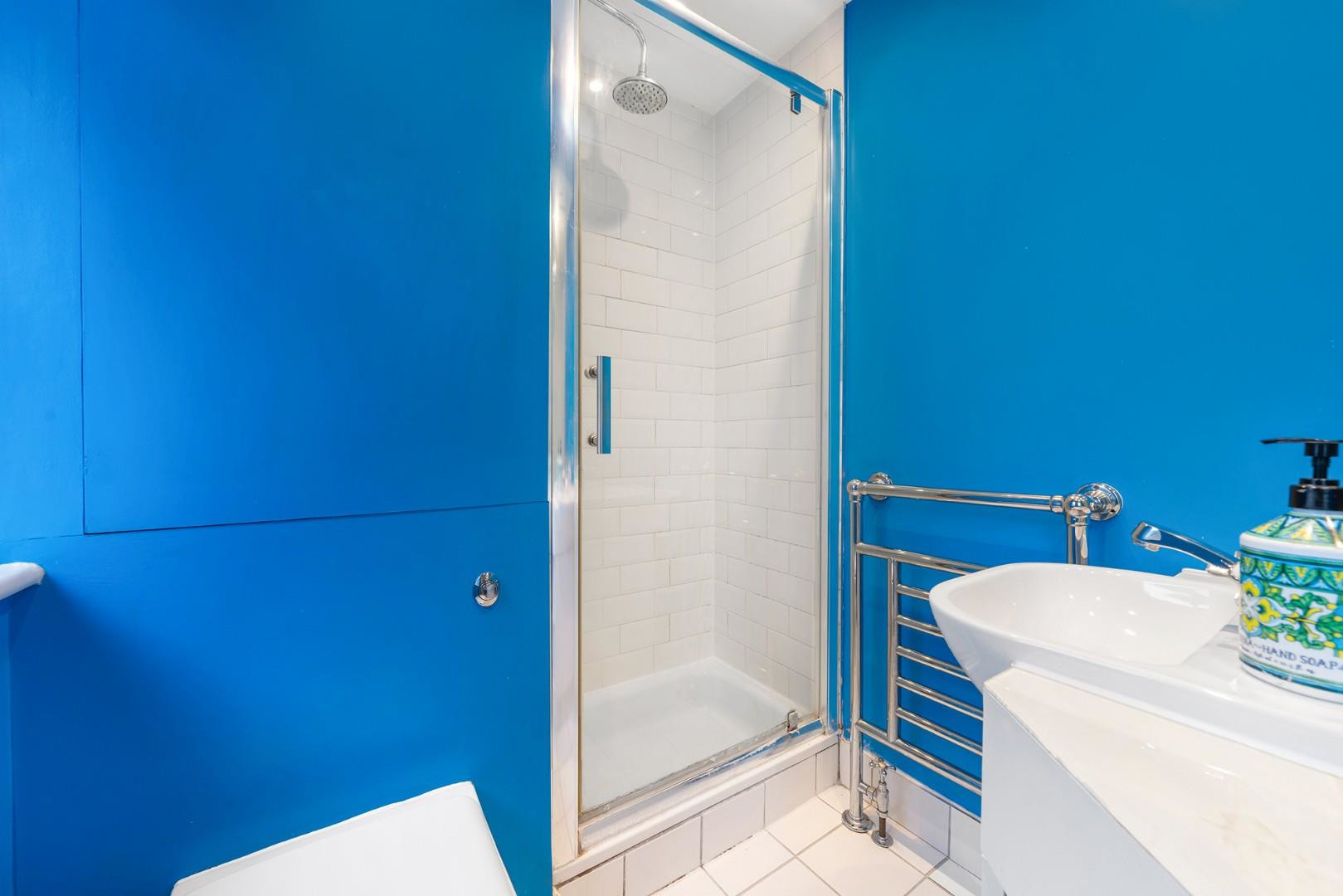 The bedroom is a well-proportioned double room, peacefully positioned away from the main road and has ample space for storage within the modern fitted wardrobes. A contemporary bathroom leads off the bedroom, furnished with a walk-in shower cubicle and finished with heated towel rail.