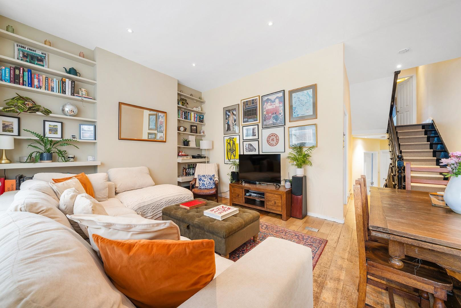 The heart of the home is the reception room at the front of the first floor, offering generous proportions and a warm, inviting atmosphere. A characterful bay window, complemented by an additional sash window, floods the space with natural light throughout the day. Thoughtfully designed alcove shelving provides an ideal display area, while a calming neutral palette and sleek flooring create a contemporary yet tranquil setting. There is ample space for both living and dining, making this room well suited to everyday life and entertaining.