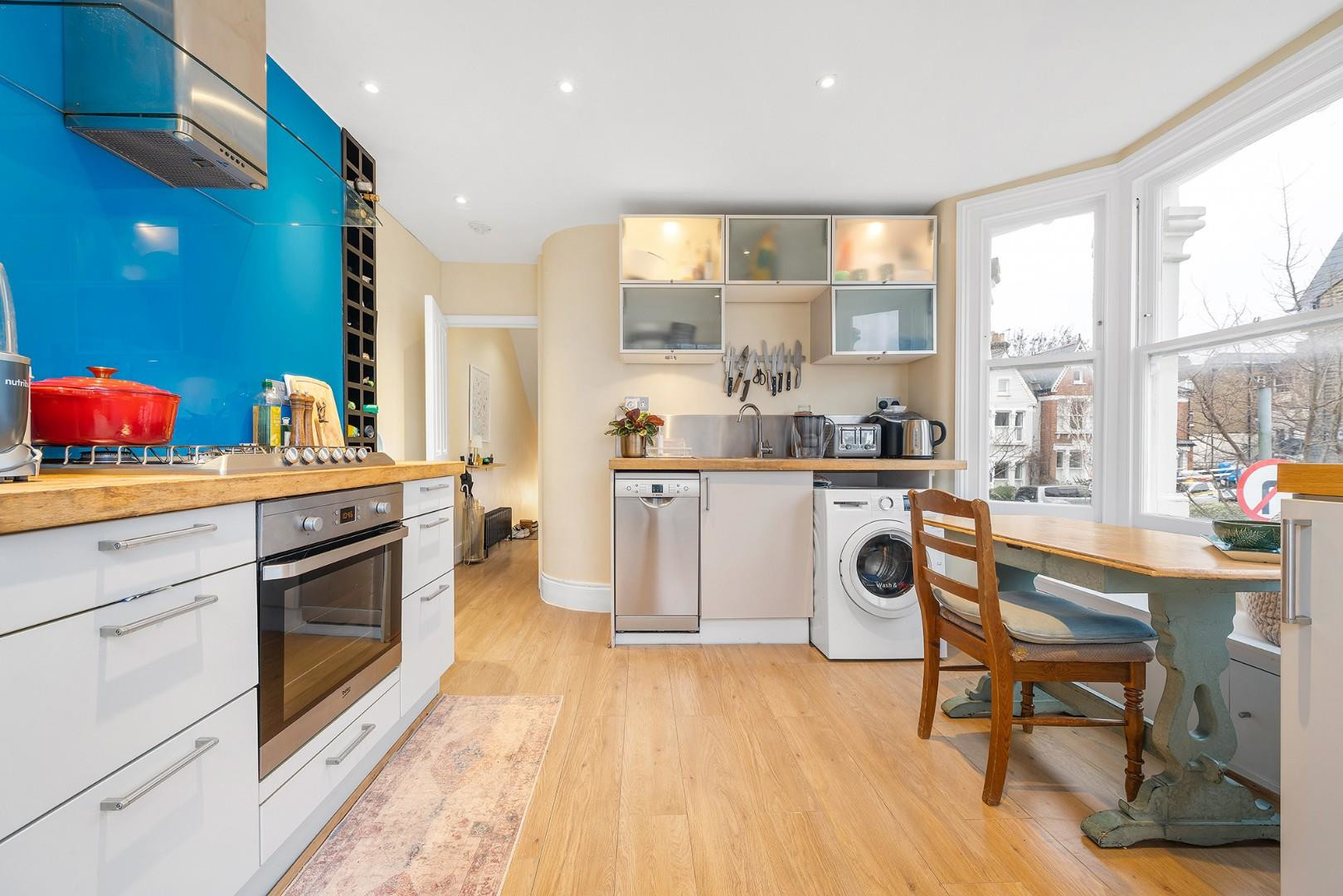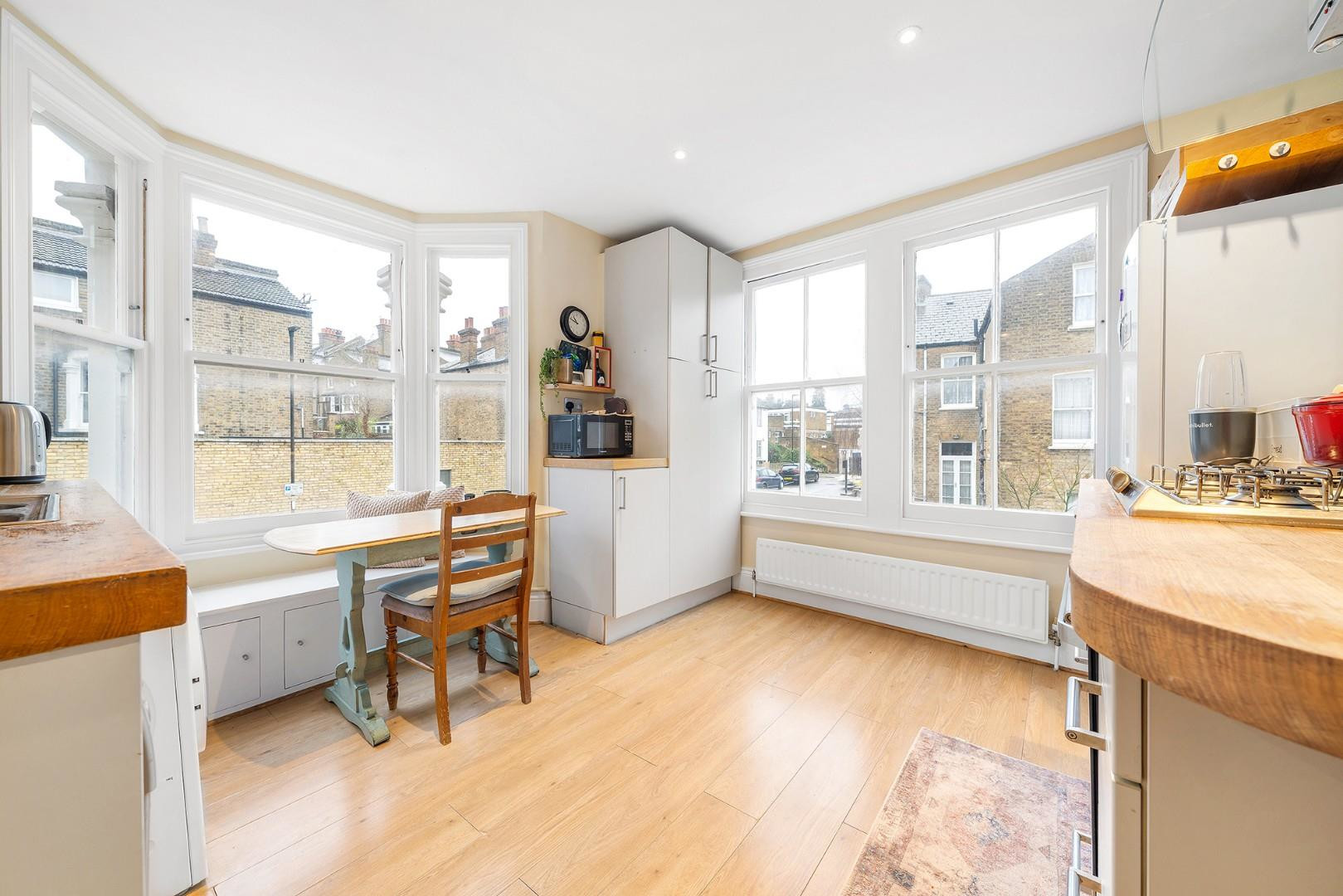 To the rear of the first floor, the kitchen enjoys a desirable double-aspect outlook over both Leander Road and Helix Road. The bay window features a charming window seat, creating a perfect nook for casual dining. Finished with elegant cream cabinetry and solid worktops, the kitchen combines timeless style with excellent functionality.