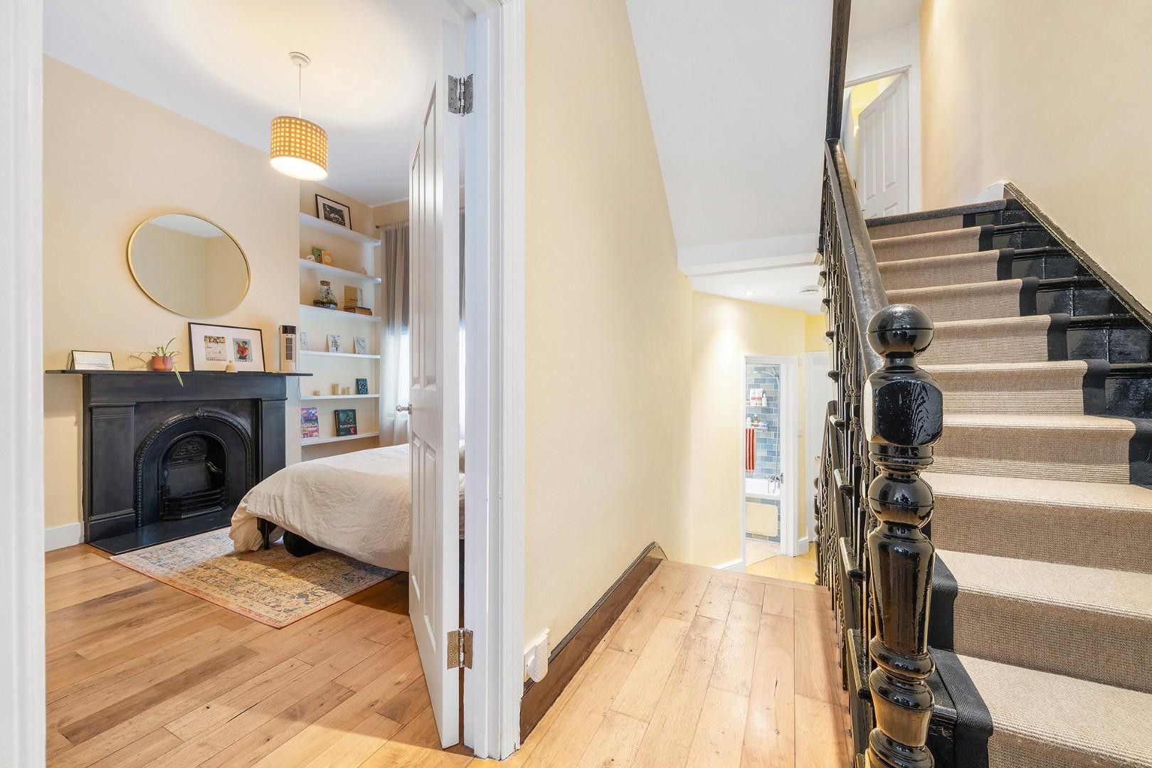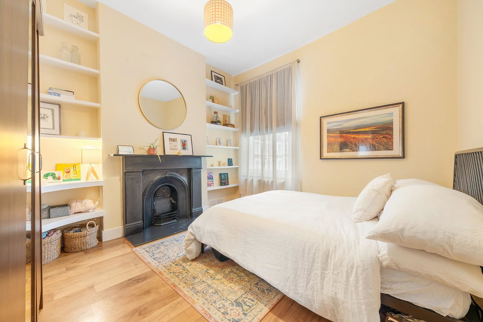 Also on this level is the family bathroom, fitted with a shower over the bath and benefiting from a window for natural ventilation. The third bedroom is also located on this floor and is neutrally presented, featuring a decorative fireplace and bespoke shelving within the alcoves.