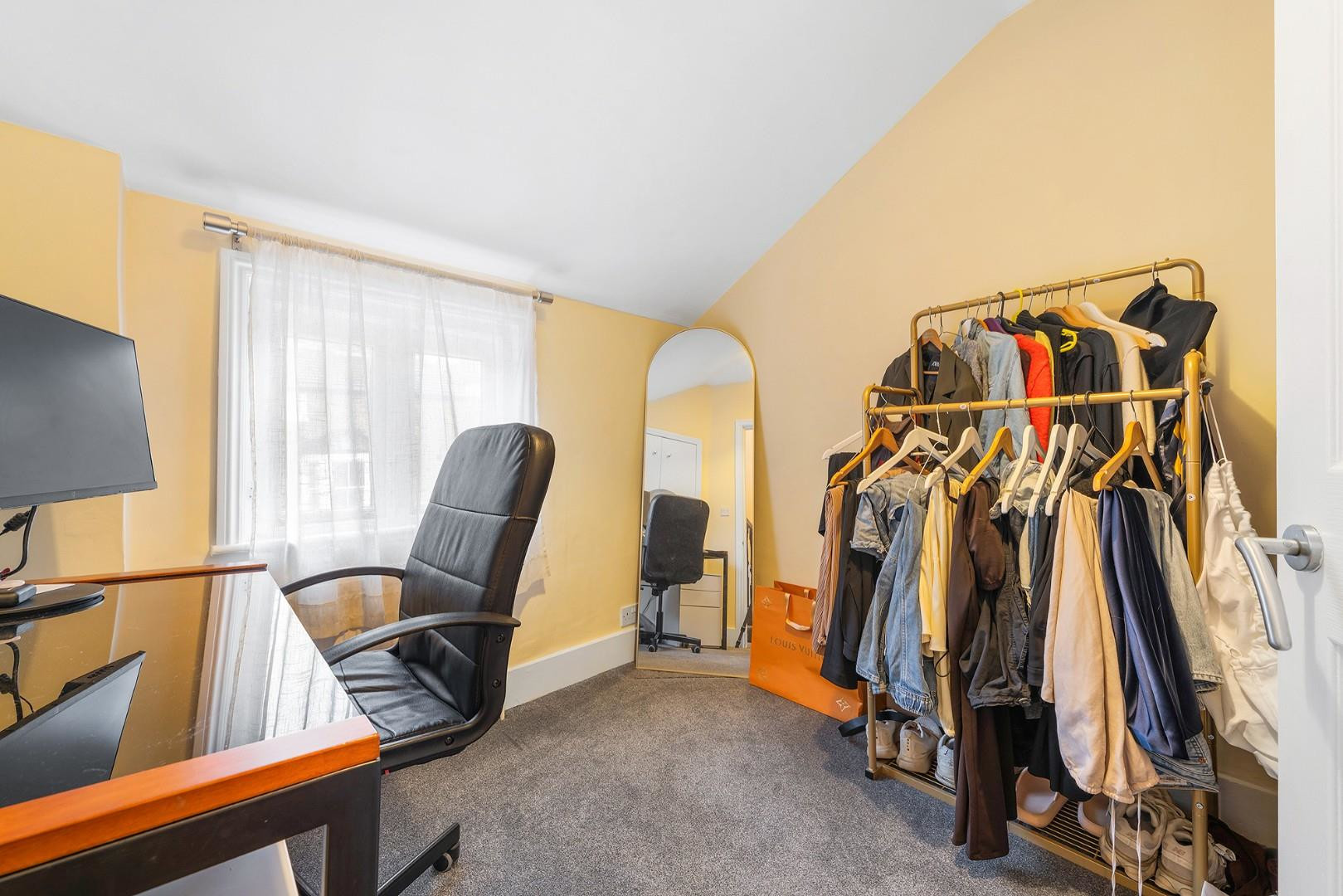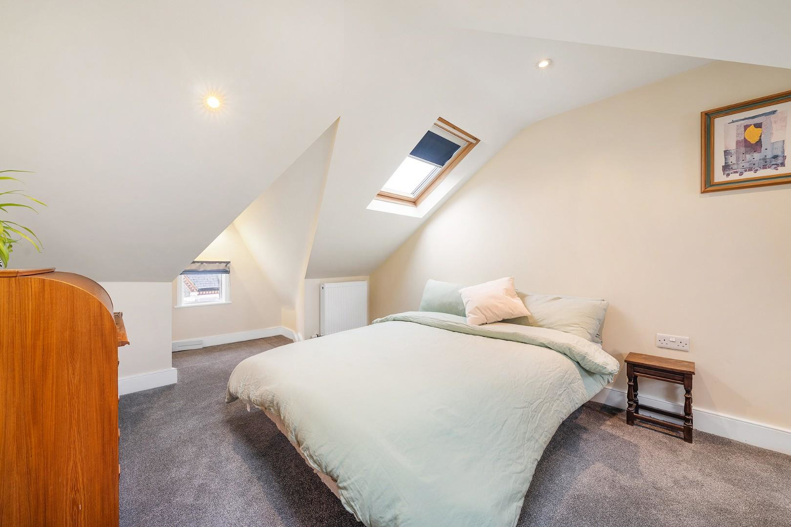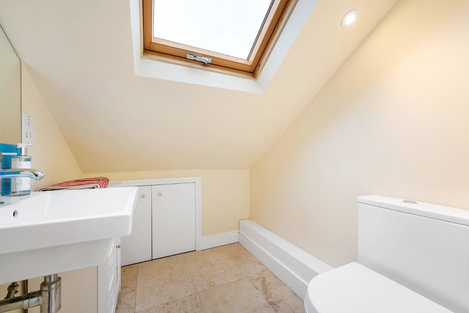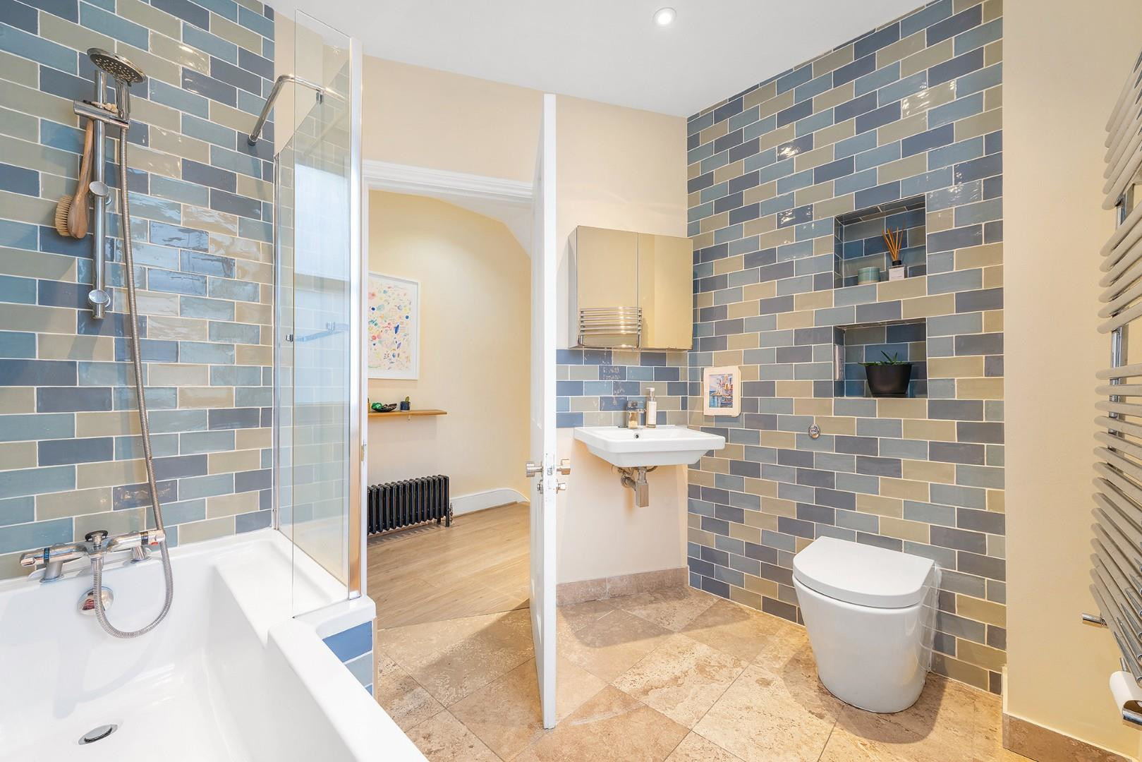 The second bedroom is a well-proportioned double at the rear, enjoying leafy views. The fourth bedroom is versatile and could be used as a children’s room, walk-in wardrobe, or home office.