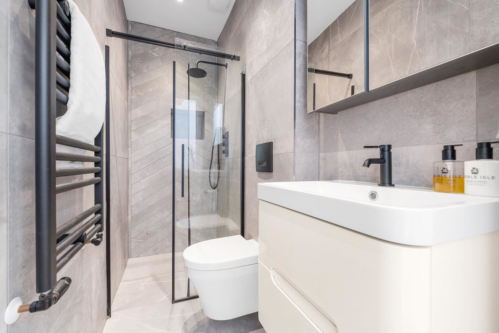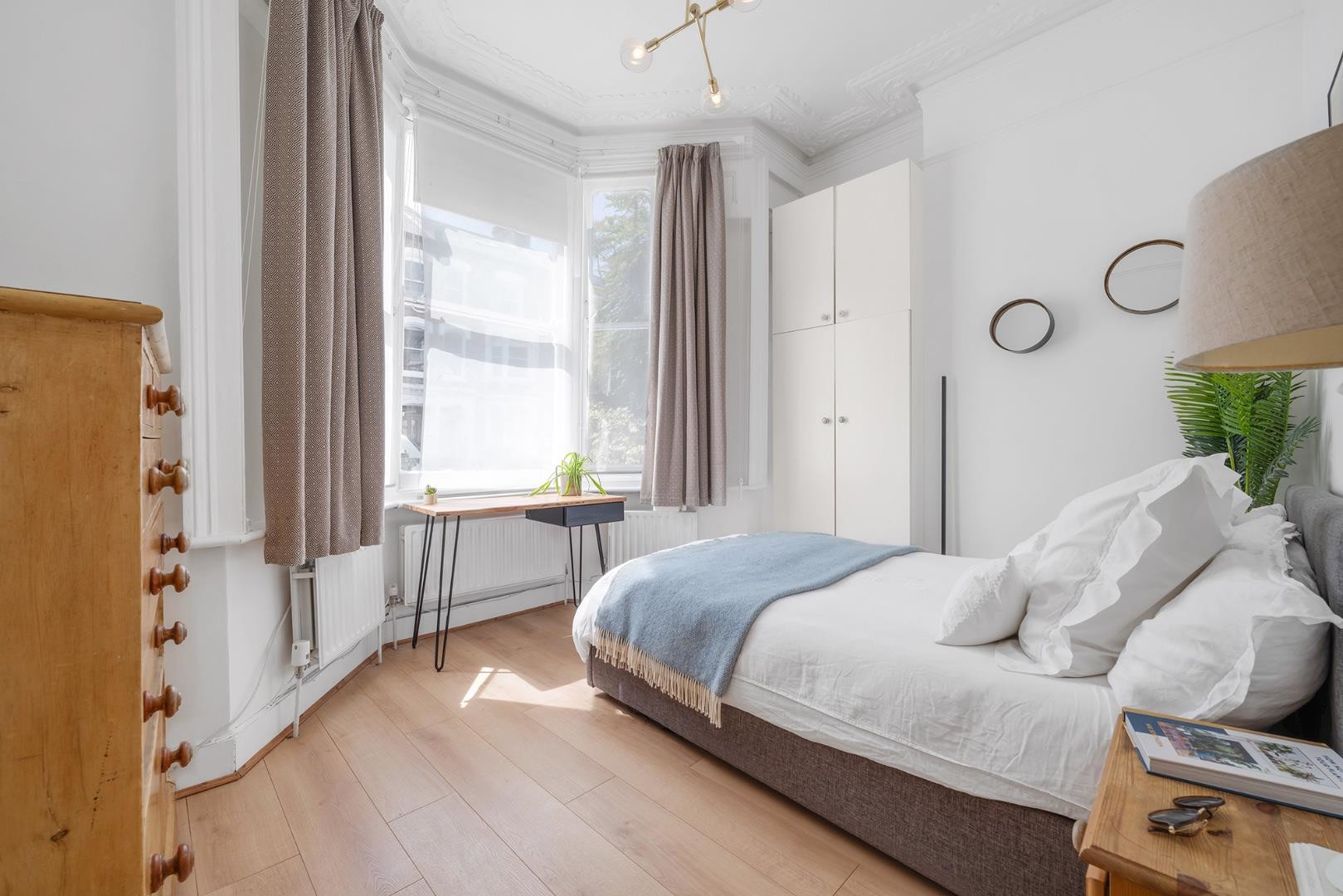 This lovely home boasts three well-proportioned bedrooms. The principal bedroom is located at the front, featuring a bay window with elegant sash frames that flood the room with natural light. This generous space includes fitted wardrobes and easily accommodates traditional bedroom furnishings, as well as a desk or dressing table if desired. A smart, tiled en-suite completes the room, featuring a walk-in shower, vanity unit, heated towel rail, and matte black fittings.