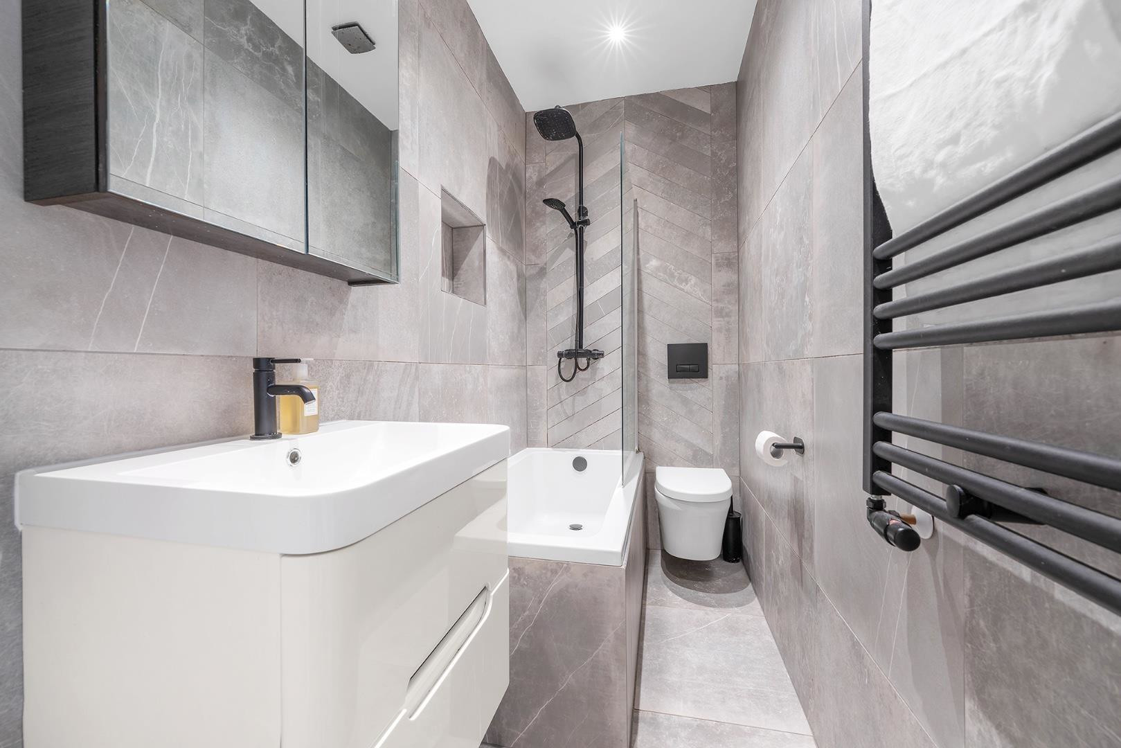 A sleek fully tiled bathroom adjacent to the second bedroom features a bath with an overhead shower. The clean, modern design and practical layout ensure the space meets the demands of contemporary living.