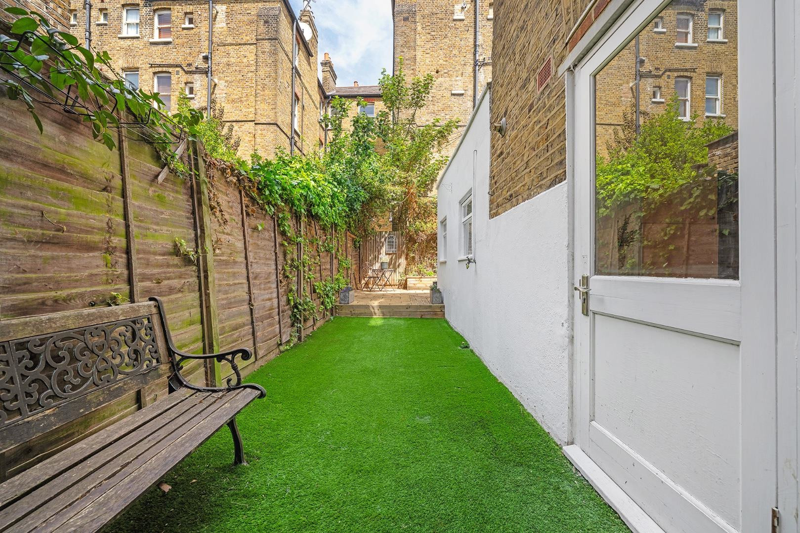 A back door from the reception room leads to the low-maintenance private garden, a wrap-around outdoor space that provides a tranquil escape from the hustle and bustle. The garden is divided into sections with artificial turf along the side, as well as decking and a patio area at the rear. In the warmer months, it’s easy to imagine enjoying morning coffees in the sunshine or relaxed weekend lunches with friends.