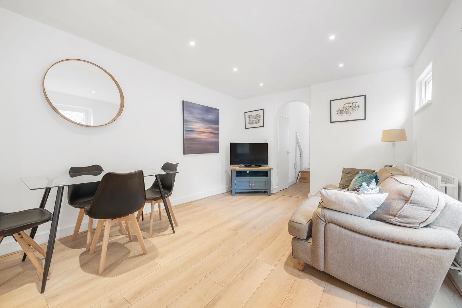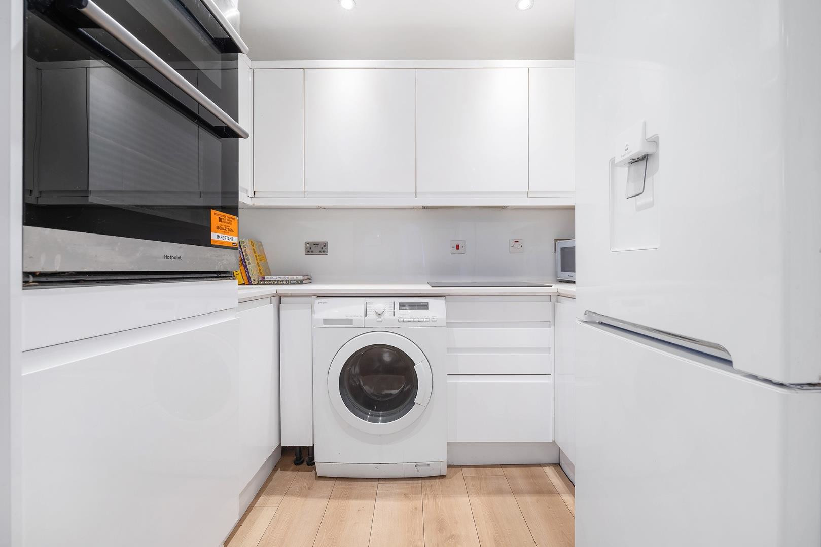 Forming the heart of the home, a bright and airy reception room is located towards the rear of the property. With generous proportions and flooded with natural light, this space is ideal for both relaxation and entertaining, offering ample room for a dining area. High ceilings and a calm, neutral palette combine to create a welcoming atmosphere. Flowing seamlessly from the reception room is the fully fitted modern kitchen, featuring sleek, gloss-finish cabinetry and integrated appliances. Offering excellent storage within wrap-around units, there is also plentiful worktop space for food preparation, making it a lovely place to cook while entertaining guests. A separate W/C is conveniently located off the hallway.